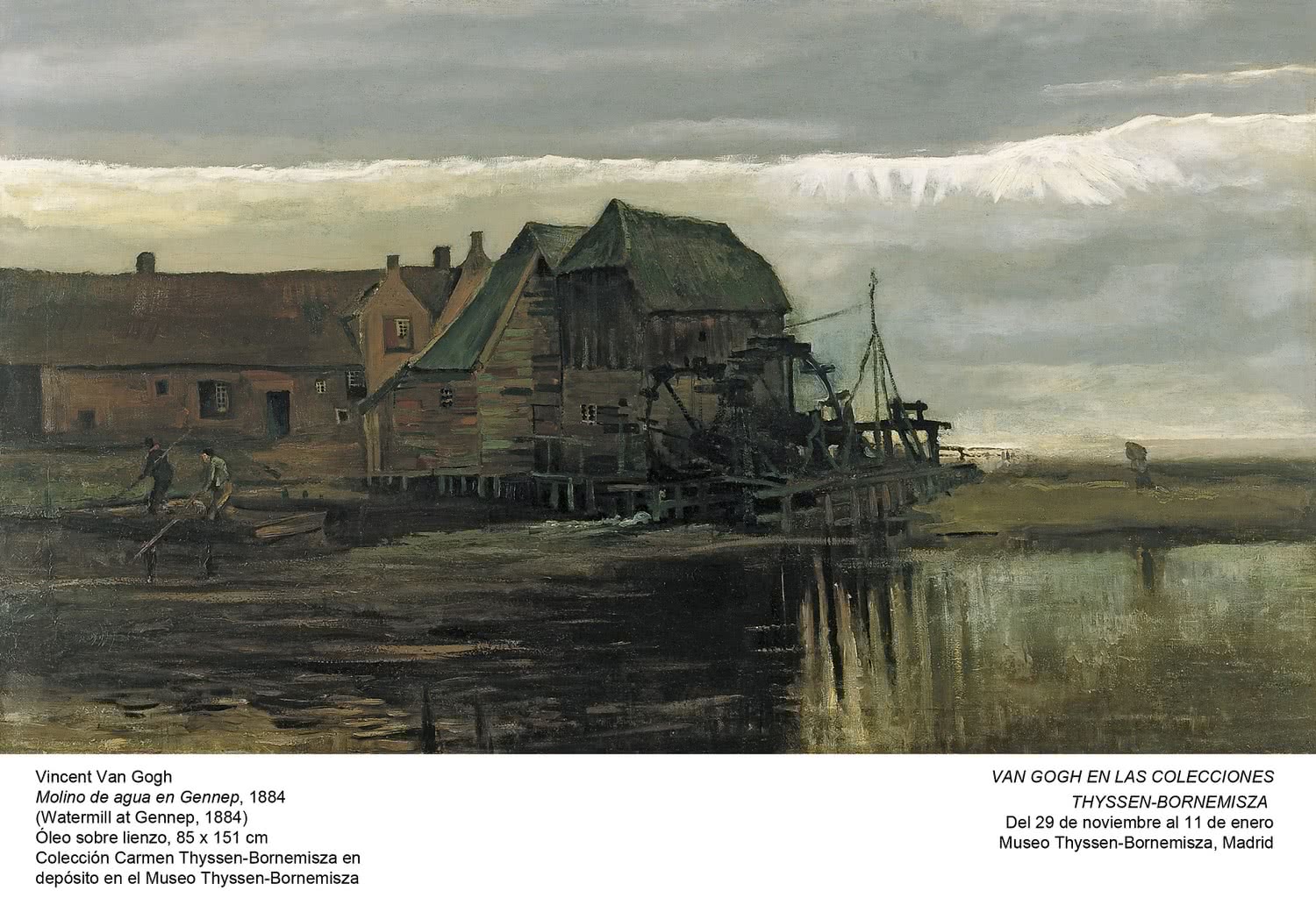 Molino de agua en Gennep, de la colección Carmen Thyssen-Bornemisza, es el lienzo más grande pintado por Van Gogh y una de las obras maestras de su etapa holandesa. La gama de colores y texturas sugieren el intenso frío y la humedad de esos días del final del otoño en Brabante. Con su doble rueda y la estructura de madera que se reflejan en el agua, el molino parece a un extraño barco anclado en el río Dommel. Hay dos figuras en una balsa. Una grieta de luz rasga las nubes grises e ilumina el cielo con una luz inusitadamente blanca y fría, sobre la cual la masa oscura del molino destaca con un fuerte efecto de contraluz.