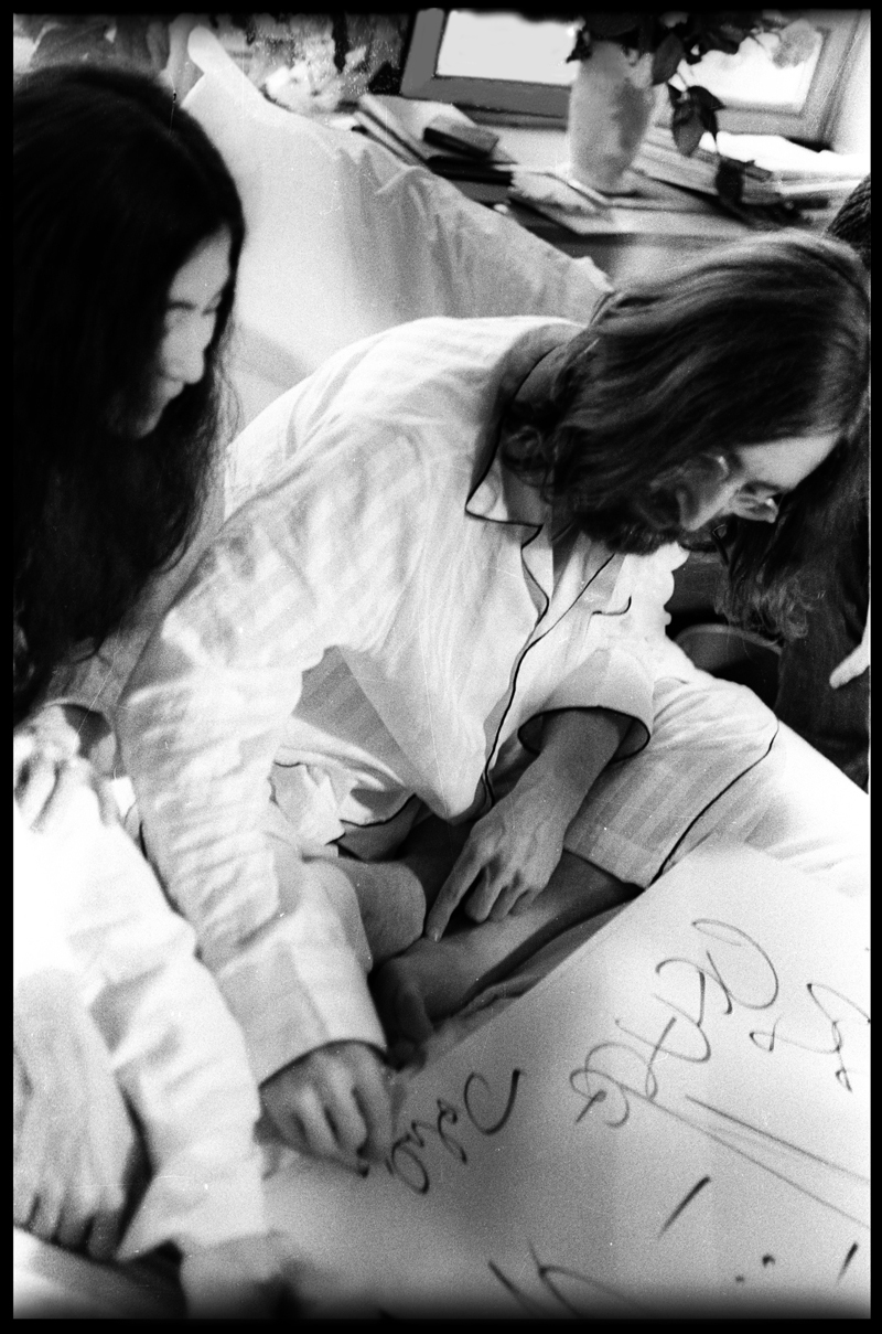 Un joven italiano de 19 años, Bruno Vagnini, que estaba cursando Fotografía en la Academia de Bellas Arte de Montreal, es invitado por un conocido a encontrarse con John y Yoko. Estaba tan emocionado que hasta lleva su cámara Nikon comprada unos días antes con un sólo rollo de película en blanco y negro de 36, convencido de no lograr hacer ni una fotografía. En la espera, en la antesala, realiza algunas fotografías a la hija de Yoko, Kyoko, creyendo que dentro no va a poder tomar ninguna imagen. Después es acompañado a la Suite 1742: una habitación enorme, pintada de blanco, con libros, folletos esparcidos por todos lados y eslóganes contra la guerra por las paredes. Al fondo, John y Yoko, en pijama, sentados en la cama respondiendo a los periodistas. El dormitorio se transforma en un púlpito político y a los que critican el acto como una payasada publicitaria, los seguidores del ex-Beatle les responden que se trata de una performance que cuestiona las definiciones de identidad, privacidad y espacio. Vagnini logra hacer 26 fotos a la pareja a pesar de su posición a contraluz, delante de la ventana.