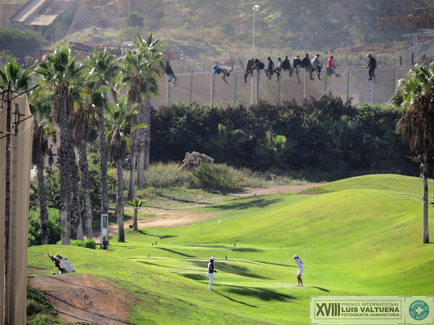 En la muestra, que tras su paso por Madrid viajará a otras ciudades españolas, se exhibirán 39 instantáneas. Paisajes de desolación ha sido la ganadora. Palazón, fundador de la Asociación Pro Derechos de la Infancia (PRODEIN) tomó esta imagen el pasado 22 de octubre en Melilla y en ella aparece un grupo de inmigrantes subsaharianos subidos a la valla de Melilla junto a un campo de golf en el que dos jugadoras continúan con su partido, indiferentes a lo que está ocurriendo.