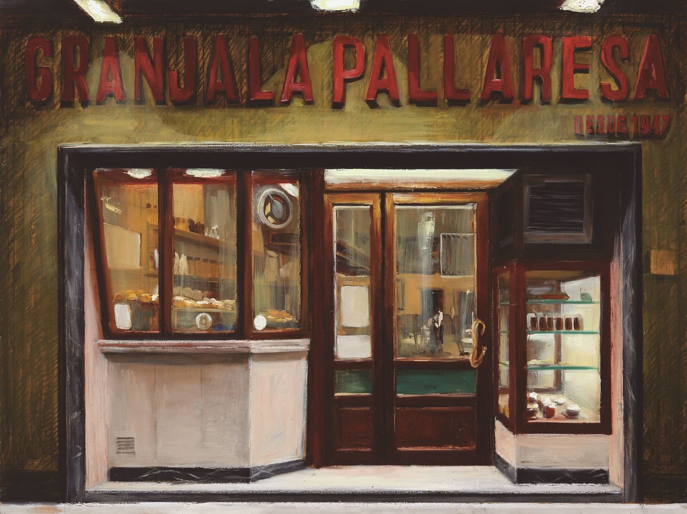 Bares como La Confiteria o el Núria de la Rambla, librerías como La Central, restaurantes como el Flash-Flash o el 7 Portes, y tiendas como el Colmado Quílez, el horno Mistral o la sombrerería Obach, de la calle del Call, son algunos de los lugares que se muestran en la exposición. Pero también pone la mirada pictórica en su barrio, el Poblenou, con paisajes del 22@, la Fundación Vila Casas, la tienda de ropa de trabajo La Africana o la coctelería Balius.