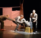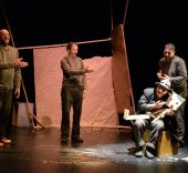 El lenguaje pasa a un segundo plato, se vuelve neutral, ya que los actores han escogido utilizar el italiano como medio de expresión, que sirve para fortalecer el mensaje. Dentro de la escenografía, cada objeto, realizado con materiales orgánicos, puede tener, y tiene, diferentes funciones y usos.