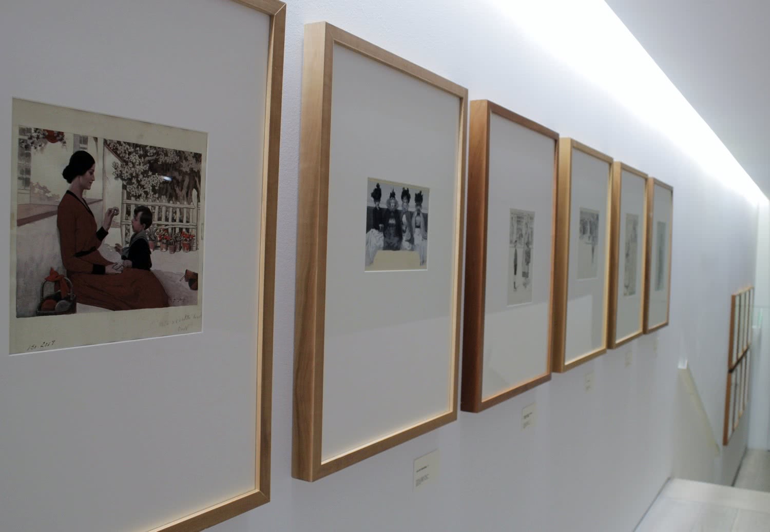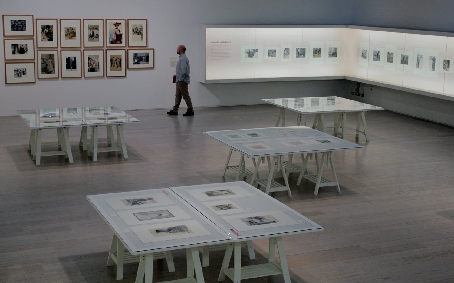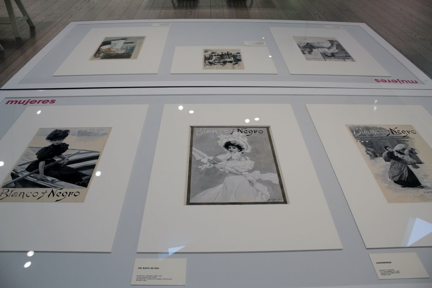 El primero de ellos tiene que ver con el Estilo, y en él se puede ver su evolución desde un tipo de realismo casi fotográfico hasta otro con predominio de la línea como recurso gráfico; la segunda sección se titula Cronista de su tiempo, y muestra el carácter documental de su obra, que recoge el testimonio impagable de múltiples aspectos de la vida cotidiana en España, desde el periodo de la Regencia hasta los primeros años de la Segunda República; Ilustrador polifacético presenta la destreza que demostró con la estampa de diferentes temáticas, y finalmente Mujeres, donde se muestran sus retratos femeninos de aspecto juvenil, bello y refinado.