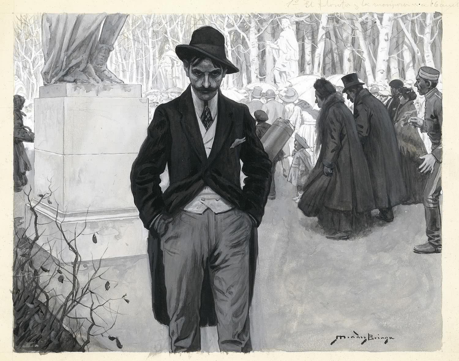 Comisariada por Víctor Zarza, crítico de arte y profesor de la Facultad de Bellas Artes de la Universidad Complutense de Madrid, la exposición presenta una galería casi fotográfica de una España situada entre dos siglos. El espectáculo de la ilustración se centra en el trabajo que Méndez Bringa llevó a cabo para la revista Blanco y Negro y se estructura en torno a cuatro bloques temáticos que representan los mundos en los que se movía el creador.