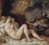 Junto a ellas se puede apreciar otra de las versiones de Dánae, conservada en el Prado, que fue realizada por Tiziano hacia 1565 y emparejada a Venus y Adonis en las «bóvedas de Tiziano» en el Alcázar.
