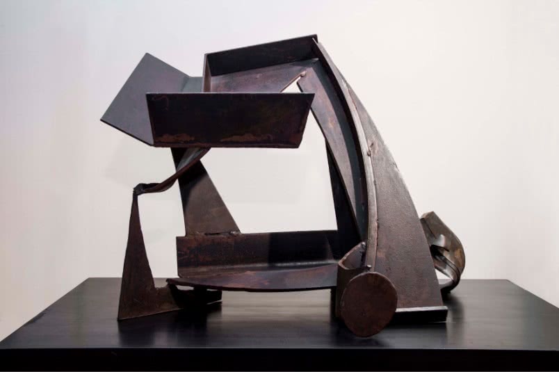 Por último, las dos obras de Anthony Caro pertenecen a una misma serie, Table Pieces [Piezas de mesa], iniciada en los años sesenta, en la que el artista desarrolla las múltiples posibilidades existentes bajo el común denominador de una mesa como soporte. Aunque datan de momentos distintos –una de ellas es de 1975-76 y la otra de 1982-83–, Caro utiliza en ambas el ensamblaje como medio de construcción, y el acero, que deja desnudo y desprovisto de color, de modo que su calidad y grado de oxidación sirvan de aglutinante visual de las partes que lo integran.