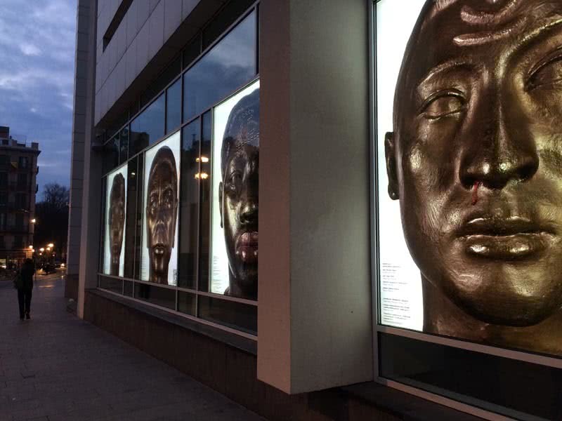 Cuatro fotografías retroiluminadas de grandes dimensiones se incrustan en las blancas estructuras de aluminio y vidrio que separan el interior del exterior del MACBA. Son imágenes de cuatro de los muchos bustos antropológicos que el escultor y etnólogo Eudald Serra i Güell modeló durante sus viajes alrededor del mundo, a la búsqueda de objetos para la colección del Museu Etnològic de Barcelona.