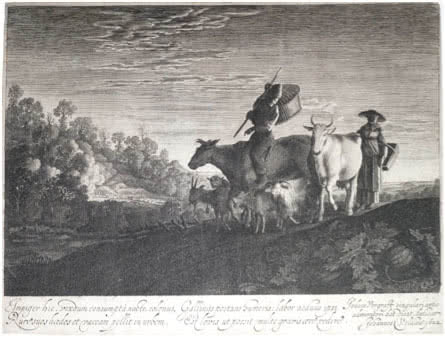 Finalmente se encuentran los Paisajes con Animales, con los que se acompaña a las figuras. Se desarrollan, de este modo, escenas de caza o simplemente pastoriles. En otros grabados son los animales los únicos protagonistas de la escena, sobre todo vacas, caballos y carneros, pues eran aquéllos que acostumbraban a ver los artistas a su alrededor y que constituían elementos característicos del paisaje holandés.