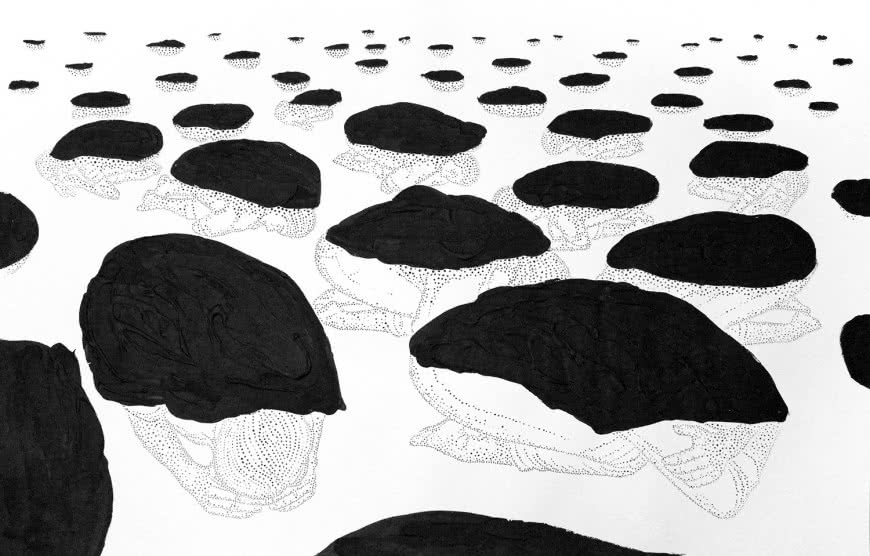 Por ese motivo, en los papeles de esta serie encontramos dos realidades, la representada por los huecos creados perforando el papel blanco, y la otra, la representada con la impronta negra (hecha de caucho y sílice). Por un lado la inmaterialidad de los dibujos perforados, del vacío del hueco; y por el otro, la masa negra utilizada dando fisicidad a las sombras.
