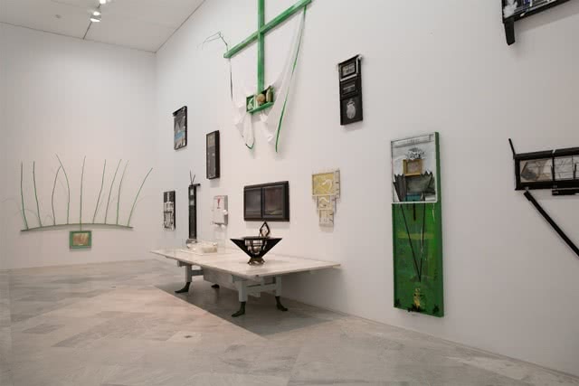 La muestra se compone de más de cien obras en pintura, escultura, diseño y arquitectura que realizan un recorrido por la vida artística de este creador desde los años 60 del siglo XX a la actualidad. En su primera época los soportes son en su mayoría en madera cubierta de esmaltes, hay también collages y una gran variedad de objetos.