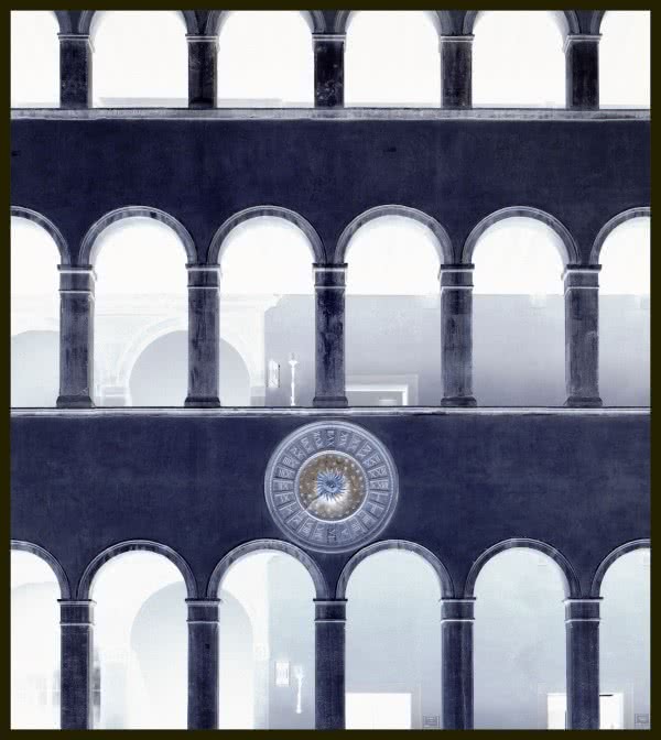 Los interiores venecianos, por su parte, llevan a otra época, fotografías de patios o estancias impresas en vidrio para conseguir un efecto óptico en su percepción. Estas fotografías destacan por su maestría en la composición, lo que evidencia la inequívoca condición de Hütte como miembro de la Escuela de Düsseldorf y, especialmente, la influencia de Bernd Becher.