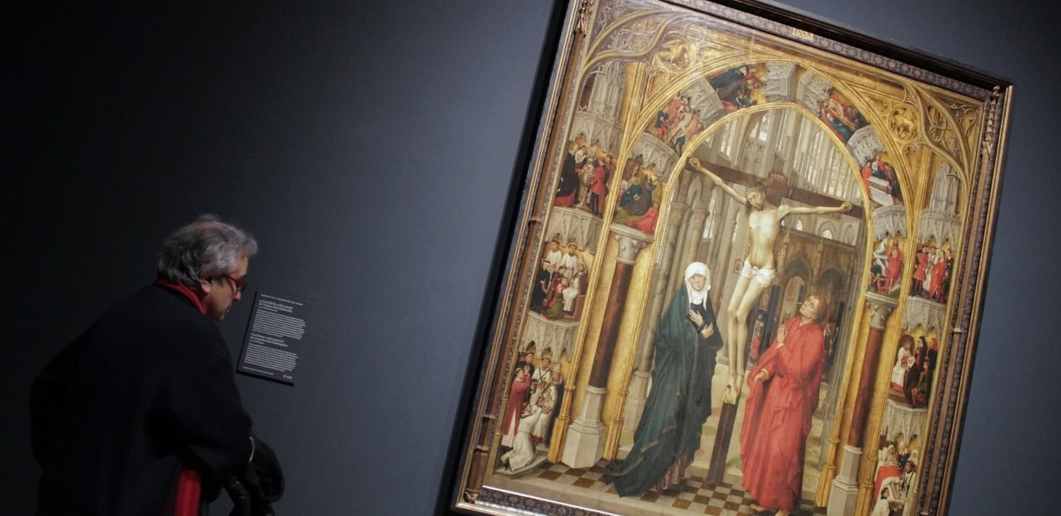 Comisariada por el investigador Lorne Campbell, la muestra plantea la posibilidad de contemplar el mismo asunto iconográfico del Calvario en otras obras del artista vinculadas a su taller. Además destaca la relevancia de los mecenas y coleccionistas contemporáneos del artista que estimaron sus creaciones. La exposición recoge así retratos de Felipe el Bueno y de su hijo Carlos el Temerario, que aparecen en un manuscrito florentino de tema histórico y que copia originales de Van der Weyden. Isabel de Portugal, esposa y madre de estos dos duques de Borgoña, fue también una importante mecenas del artista flamenco, como revela el retrato encargado al pintor.
