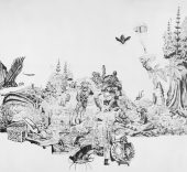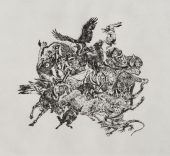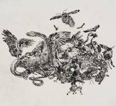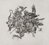 La Caza se compone de diversas piezas formadas por imágenes extraídas de los tomos titulados Ciencias naturales y Curiosidades del reino animal, pertenecientes a la Enciclopedia Bruguera (1978), a partir de las que la artista realiza un trabajo de apropiación, descontextualización y condensación de imágenes para construir una obra que evidencia el cambio de la relación entre el hombre y la naturaleza en los últimos 30 años.