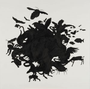 La exposición se compone de Isla, un mural realizado en tinta negra aplicada directamente sobre la pared, que ocupa la totalidad de uno de los paños de la sala; la serie que da título a la exposición, formada por cinco grabados realizados con la técnica de punta seca sobre papel y por tres tintas negras sobre papel; y un conjunto de retratos de diversas especies de simios, realizados en tinta negra sobre papel y expuestos en vitrina, a modo de gabinete de ciencias naturales, bajo el título genérico de Ellos.