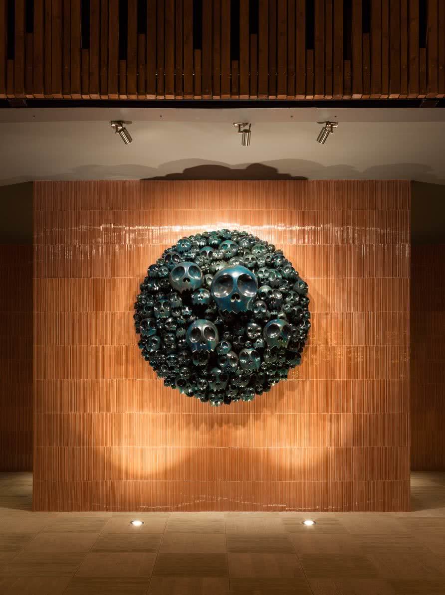 El visitante también se encontrará con cuadros de bolas de flores, que combinan el estilo optimista y colorido de flores con rostros sonrientes que tanto caracterizan al artista, con las técnicas artesanales de serigrafía y gestuales que domina; y también se expone Dragon Heads–Gold (Cabezas de dragon–oro, 2015), una escultura de pan de oro montada en la pared donde se precipitan un sinnúmero de calaveras, superponiéndose y fundiéndose entre sí, creando un brillante efecto de distorsión de la superficie y la profundidad.
