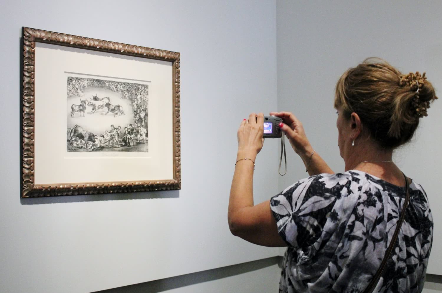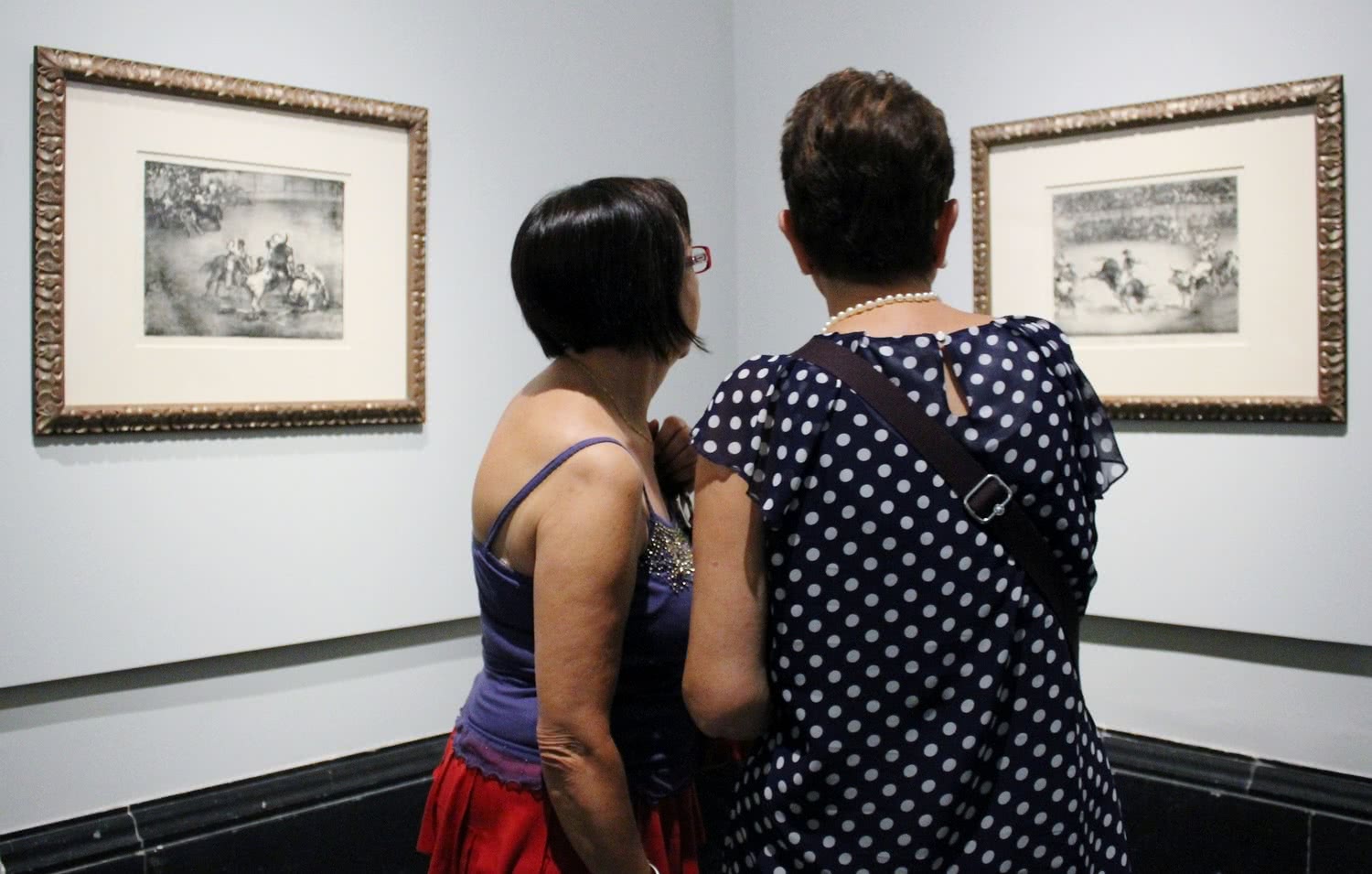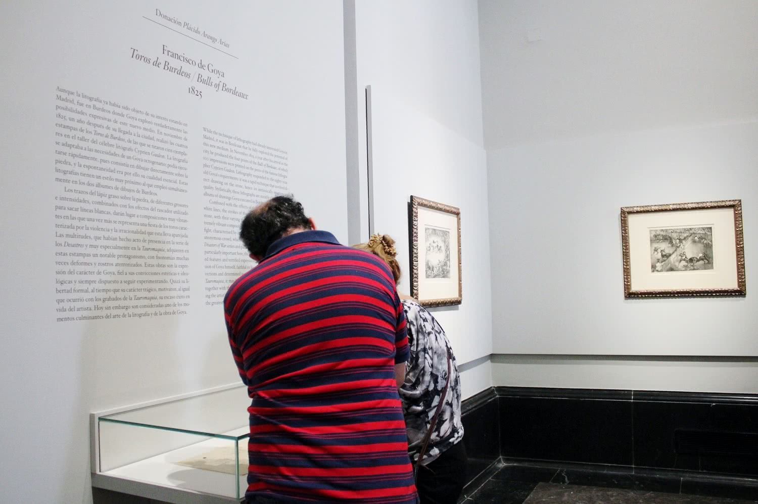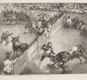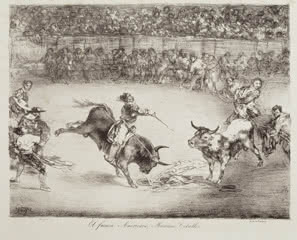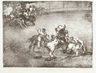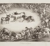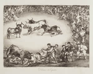 Estas cinco pinturas se completan con cuatro estampas de Goya, una serie titulada Los toros de Burdeos (1825) que se muestran en la sala 66: El famoso americano Mariano Ceballos, Bravo toro, Dibersión de España y Plaza partida.