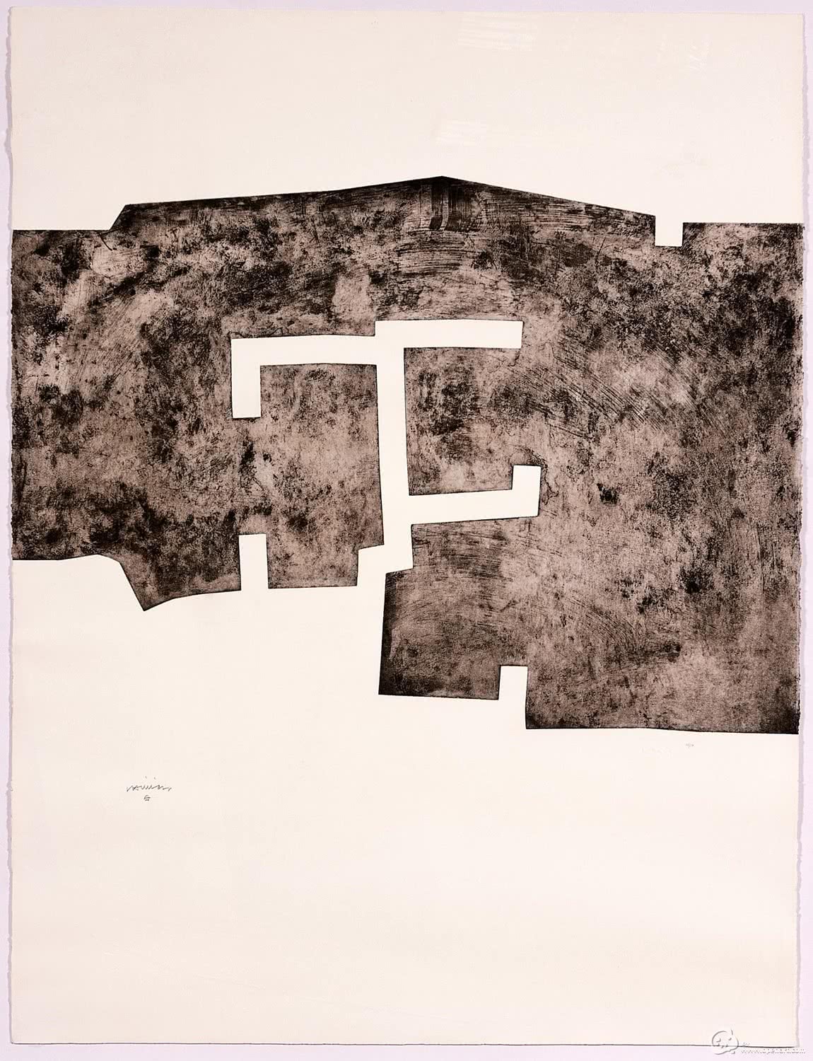 Otro de los grandes, Eduardo Chillida (San Sebastián,1924 - 2002), es conocido fundamentalmente como escultor de trabajos en hierro y en hormigón. Pero una de las facetas más interesantes en su obra es el grabado, donde pueden encontrarse numerosos puntos de contacto con sus esculturas. Podría decirse que sus grabados traducen ideas formales y espaciales de su escultura.