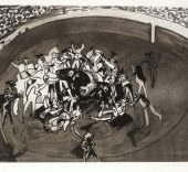 La corriente expresionista viene de la mano de Juan Barjola (Badajoz, 1919 ‐ Madrid, 2004), pintor que destacó por un gran dominio del color y del gesto. Su obra gráfica, una prolongación más de su trabajo pictórico, presenta las mismas temáticas y rasgos formales pero aplicados a esta disciplina. Las Tauromaquias de la exposición constituyen uno de los ejemplos más representativos dentro de su producción.