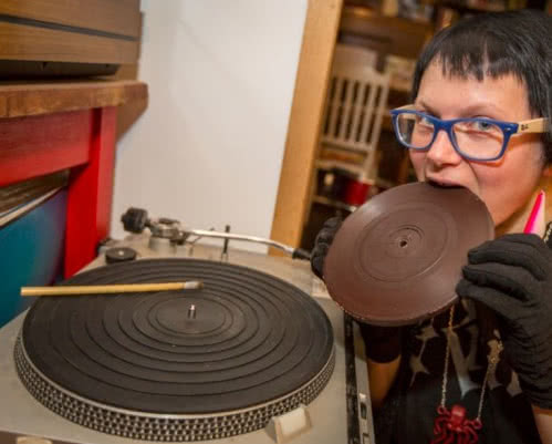 La artista utilizará ese material para grabar discos de chocolate que ella misma “cocinará” durante su residencia en Gijón. El disco de chocolate de Sweet Tribology evoca, según la artista, aquel nostálgico proceso sonoro de los olvidados cilindros de cera, pero cada vez que la aguja del reproductor toca la superficie el sonido impreso se va borrando. Al reproducir una y otra vez la placa de chocolate, se irá perdiendo el sonido original, pero se empezarán a escuchar otros muchos.