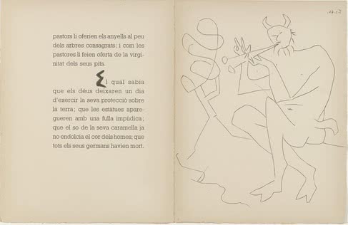 Cuando, ya exiliado en París, el artista conoció al editor Ferran Canyameres, le propuso publicar la obra de su amigo ilustrada por él. Fruto de esta idea nació la publicación Dos contes. El centaure Picador y El capvespre d’un faune, un libro para el que, en febrero de 1947, el pintor realizó cuatro grabados al buril, que se muestran en la exposición.