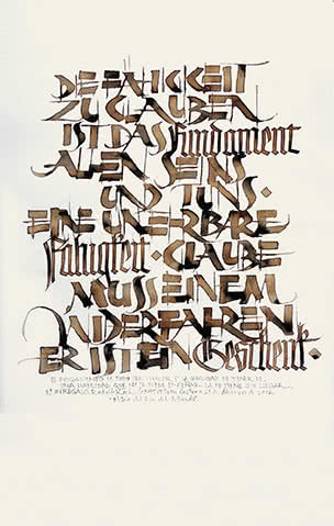El calígrafo francés de origen español Claude Mediavilla habla de una «renovación de la caligrafía» y del calígrafo profesional como un artista que no se limita a la mera copia de modelos de alfabetos, sino que traspasa las normas, aporta nuevas formas de expresión mediante el trazo y parte de la tradición para hacer nuevas propuestas que multiplican exponencialmente la capacidad gestual de la letra dándole ritmo, color y textura.