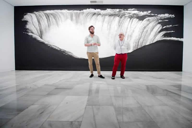 Y el tercer tipo, representado por una espectacular intervención creada en una de las paredes del museo. Un mural que conecta con su experiencia de colaboración con otros artistas, como Arnülf Rainer, Laura González, Fernando Álamo o Ray Smith. «En este caso, después de conocer esta faceta de su trabajo como colaborador o asistente de otros artistas, se le invitó a realizar su propia obra y ha logrado concebir una pieza deslumbrante, en la que crea una especie de falso agujero, una trampa al ojo, que se escapa a otra realidad y en la que el espectador se pregunta qué es lo que está pasando ahí”, apunta Omar-Pascual.