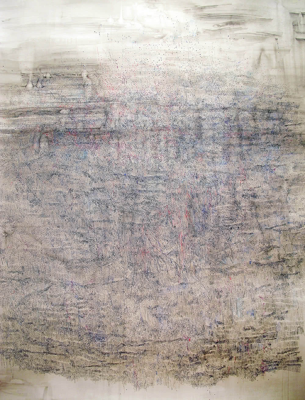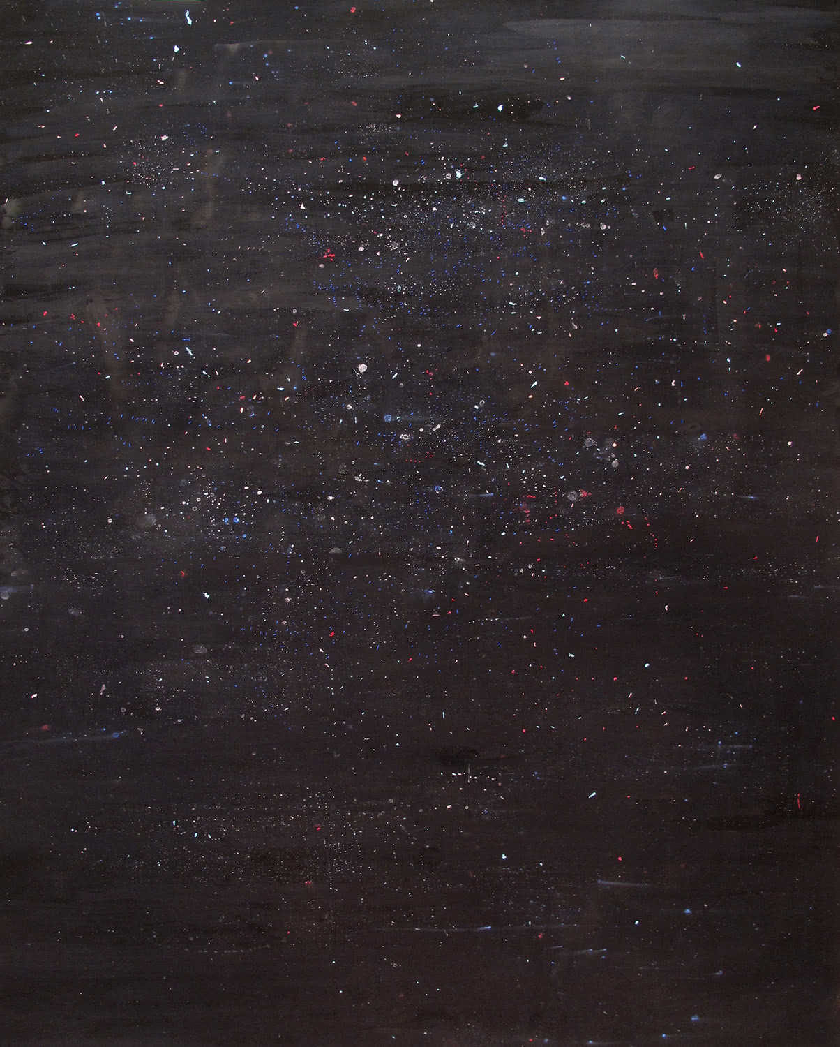 Dibujos negros de gran formato en los que predomina la línea, expansiones cromáticas estructuradas a partir del punto y trabajos en papel que han sido perforados dando paso a un nuevo paisaje en el que adentrarse. Su obra es una invitación al pensamiento, seguir el rastro de su acción es meditar el ejercicio que busca el infinito.