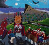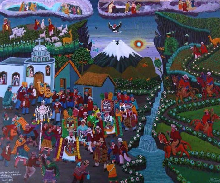 Pero el tema estrella de la pintura Tigua son las fiestas religiosas, especialmente la del Corpus Christi. Se celebra normalmente en el mes de junio. Los personajes principales de las fiestas del Corpus son los danzantes, ataviados con unos espectaculares trajes y tocados, que danzan al ritmo que le marcan el tambor y el pingullo, un tipo de flauta. Las fiestas las organiza y costea cada año un miembro elegido por la comunidad, el prioste, que suele aparecer representado en las pinturas portando un bastón de mando. Las fiestas suponen una forma de redistribución de la riqueza y en ellas se activan las relaciones sociales.