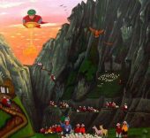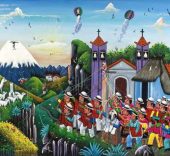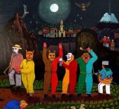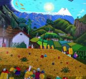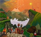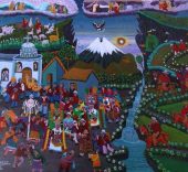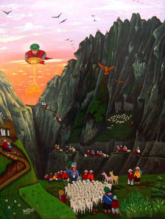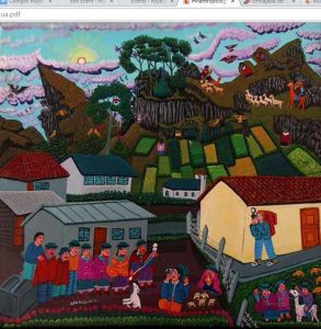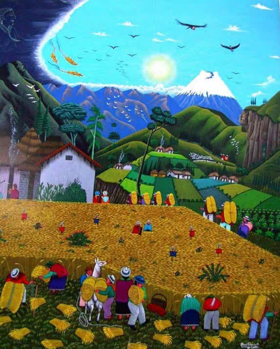 Los personajes visten la indumentaria tradicional, destacando los ponchos rojos de los hombres y los chales fucsias de las mujeres. Aunque los hombres ahora visten con ropas de estilo occidental y el sombrero blanco ha sido sustituido por uno de fieltro de color oscuro. Normalmente se encuentran tres niveles en las pinturas: en primer plano se sitúa la escena principal; hay un nivel medio con casas, campos cultivados y caminos; y un nivel superior con el páramo, las montañas y el cielo.
