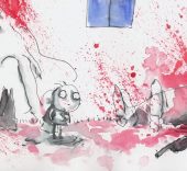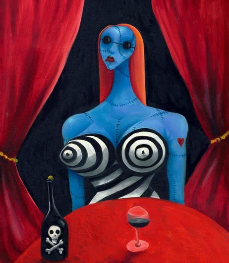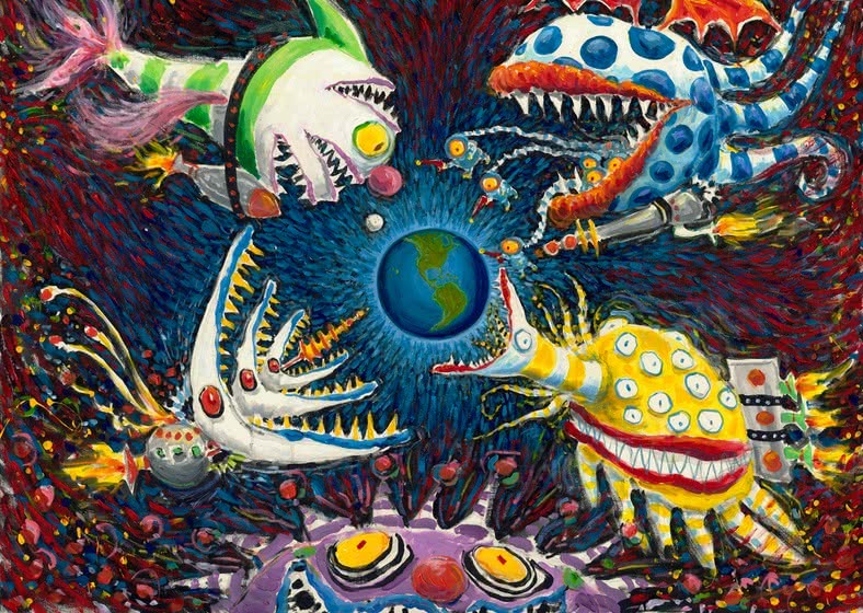 Universos llenos de colores sombríos que no son otra cosa que reflejos distorsionados de elementos de la cultura popular (como las festividades), incluidos los suburbios estadounidenses. Dibujos extraños de su etapa en Disney, los conflictos de la psicología del hombre y la bestia y una serie de fotografías Polaroid ilustran el alcance de su trabajo en los medios.