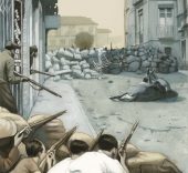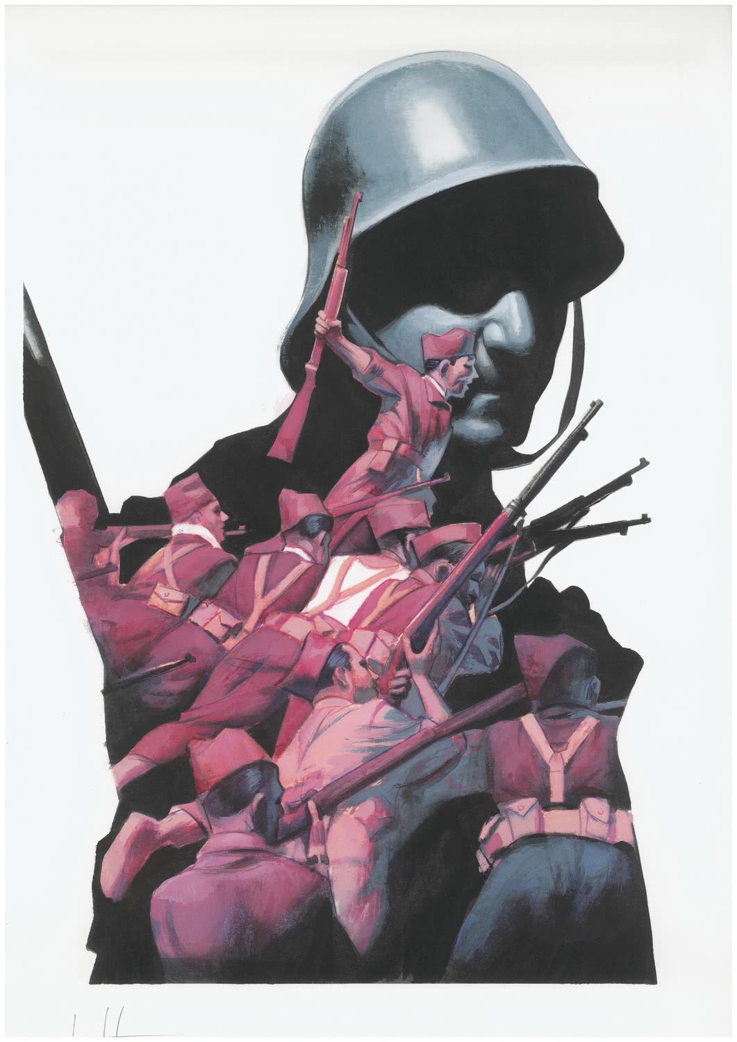 La Feria del Libro Antiguo de primavera, instalada en el Paseo de Recoletos, fue el lugar idóneo para comenzar a documentarse, «iba como esos señores mayores, caseta por caseta preguntando ¿tiene usted algo de la guerra civil? y, claro, tenían muchísimas cosas. Me fui muy cargado y comencé a destilar toda esa información hasta dejarlo en lo más esencial, tratando de representar la lealtad, el valor, el horror, y por qué no, también el honor», rememora el artista.
