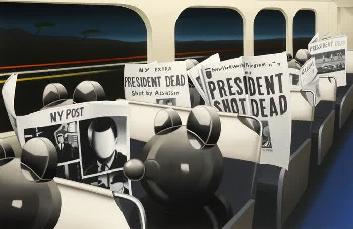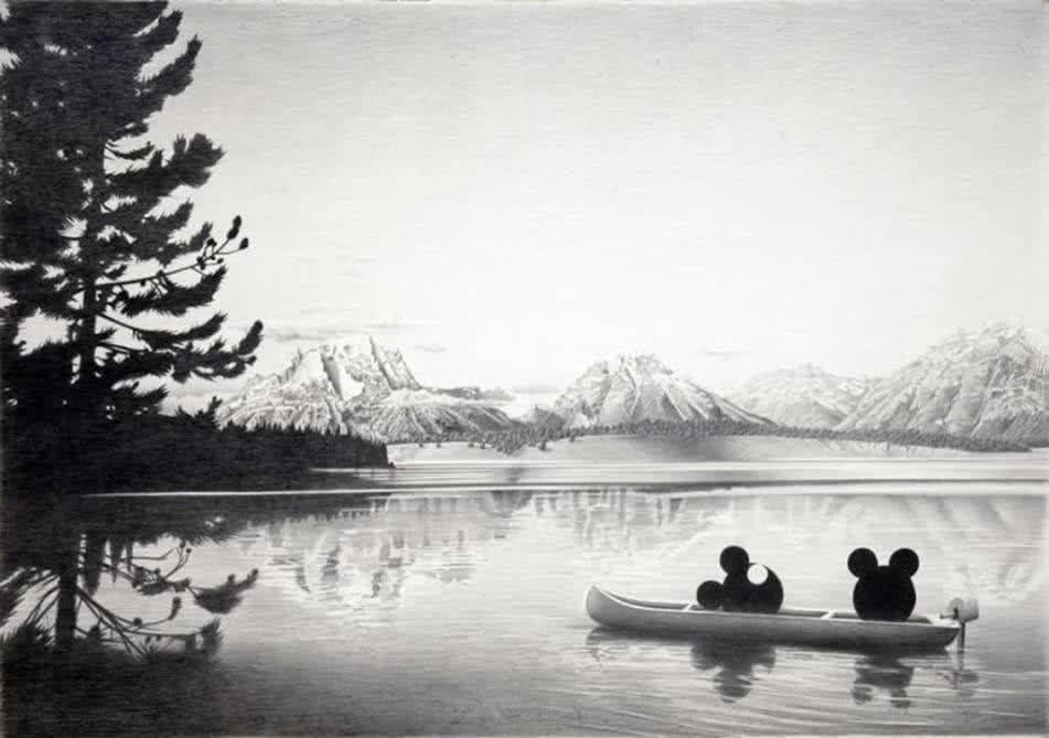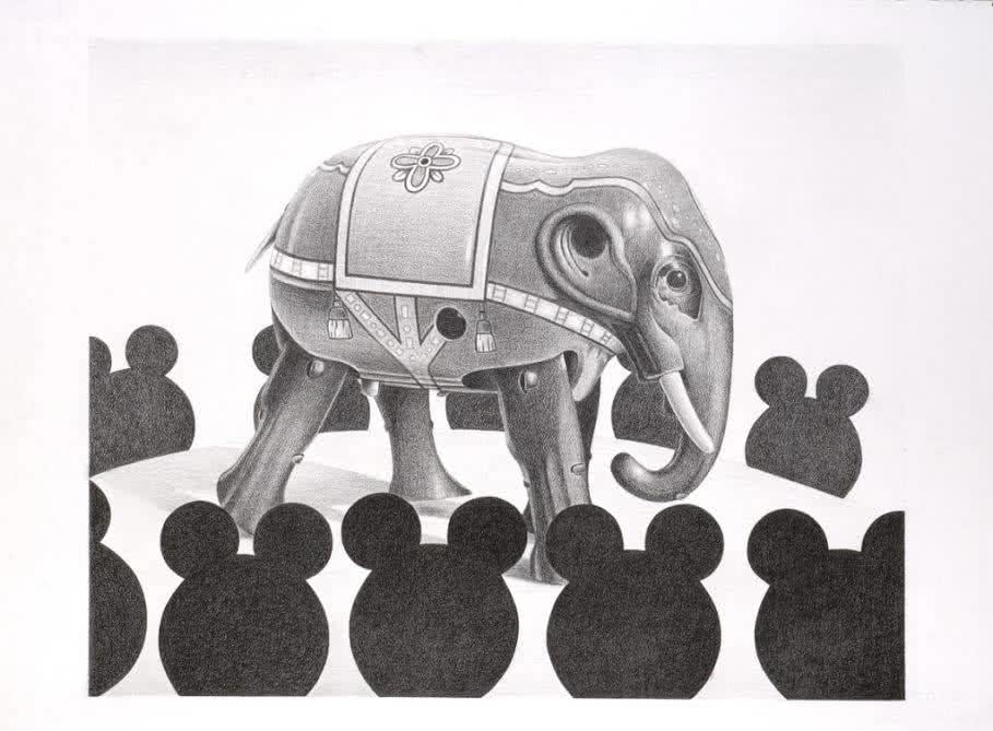 En las casi 60 obras que componen esta muestra, la silueta del ratón creado por Walt Disney aparece como una metonimia del ser humano, una licencia poética para perfilar la realidad desde sus hitos socioculturales. Así, Cuéllar habla del arte, la política, las revoluciones, la guerra y el cine elaborando un escenario donde la belleza nunca se rinde.