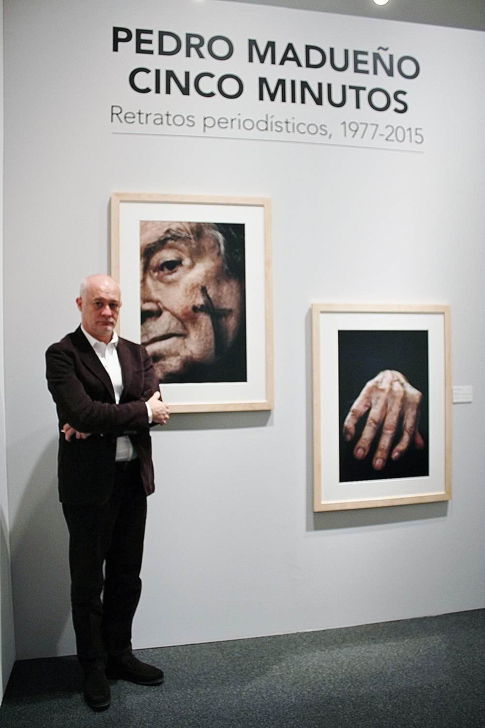 Cinco minutos. Retratos periodísticos 1977-2015 propone un recorrido por los distintos temas que el fotógrafo ha tratado en sus instantáneas a través de 48 fotografías. La exposición se abre con una sección muy amplia dedicada a los escritores Terenci Moix, Juan Goytisolo, Eduardo Mendoza, Quim Monzó y Sergi Pàmies, que Madueño ha retratado en escenarios urbanos, relacionados con su personalidad literaria.