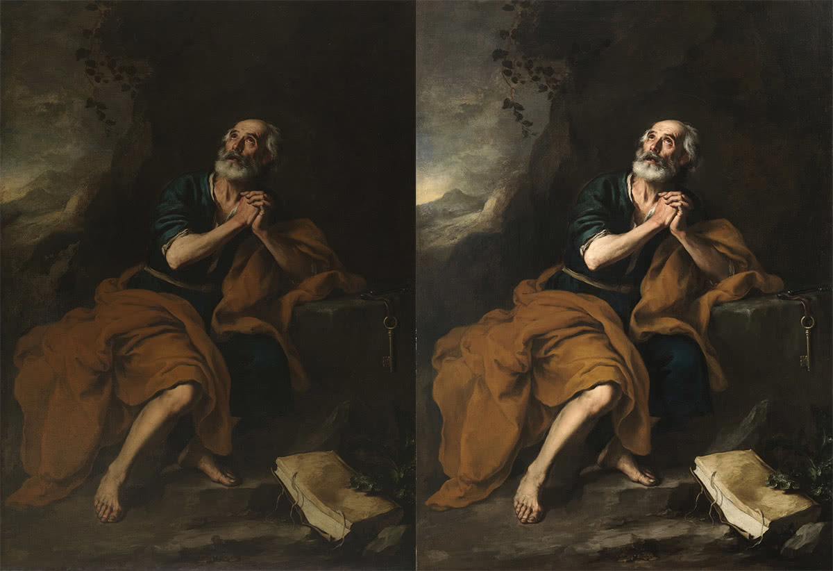 «Murillo busca una luz ambiental, más amable que la de Ribera, y todo eso es lo que no acababa de verse bien en el cuadro. Estaba muy plano. Le faltaba luminosidad», añade para explicar que estamos ante una composición piramidal. «El libro de la parte de abajo marca la dirección de la mirada del espectador. Este eje nos da a entender el espacio donde acaba la escena. Así, la mirada del espectador termina precisamente en la mirada de San Pedro, un San Pedro afligido, pero redimido. No dramático».