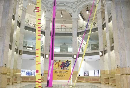Las piezas, inspiradas en la decoración del edificio, inundan de luminosidad el espacio a través de colores rosas, azules y amarillos brillantes. Las largas tiras de nylon resaltan la verticalidad del lugar y hacen reflexionar al espectador sobre la presencia de su propio cuerpo en el espacio, cómo nos movemos y lo que vemos.