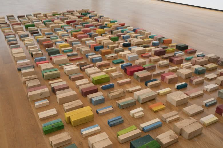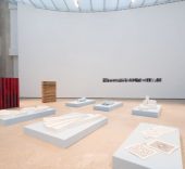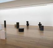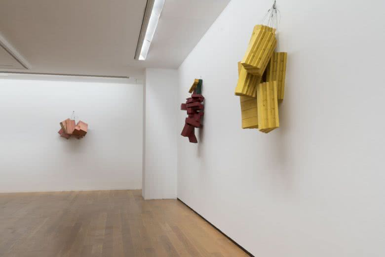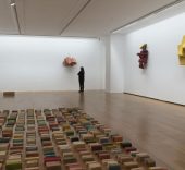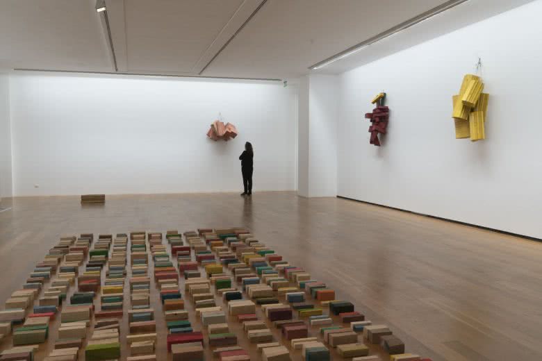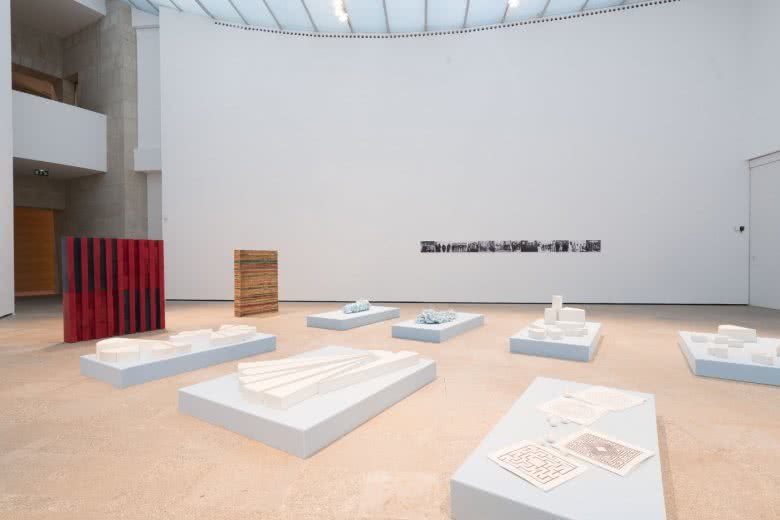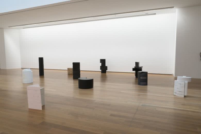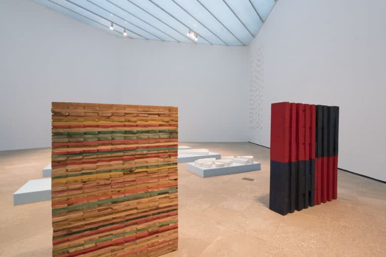 Je, je… luna incluye piezas que pertenecen al periodo de su participación en CVA (Comité de Vigilancia Artística) —colectivo concebido como “empresa artística” puesto en marcha junto a Juan Luis Moraza entre 1979 y 1985— e importantes series de trabajos como Máculas (1984-1985), Leyendas (1985-1986), Melenas (1988), Esculturas rojas (1989), 14 veces grande de España (1989-1990), Burladeros (1990) o Corridas (1996-1997). Se presentan también Burlas expresionistas (1993) y Artistas ideales (1990-1997), dos instalaciones que reúnen las principales líneas de investigación desarrolladas por la escultora a lo largo de su trayectoria.