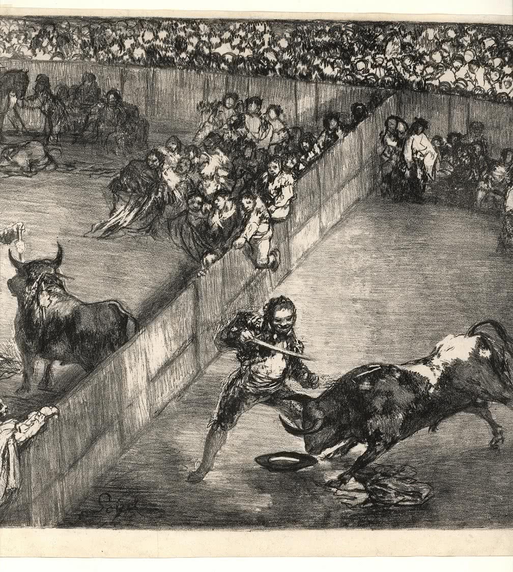 La Tauromaquia (1816) fue un fracaso comercial, entre otras razones debido a la crudeza de las escenas representadas, algo que se alejaba del tipo de estampas plácidas y decorativas que hasta entonces daban imagen a los toros. Con el paso del tiempo, estos grabados se convirtieron en hito esencial de esta fiesta. Sin embargo, diversas voces han cuestionado desde hace tiempo la imagen de Goya como aficionado a los toros basándose en el espanto presente en la mayor parte de los grabados. Una visión que se pone de manifiesto en 1824, cuando Goya realiza los cuadros últimos grabados, ya en Burdeos. En estas últimas obras, que se exponen por primera vez en Calcografía, el artista se encuentra más cercano a Los Desastres de la Guerra que a otras empresas suyas de géneros o costumbres.