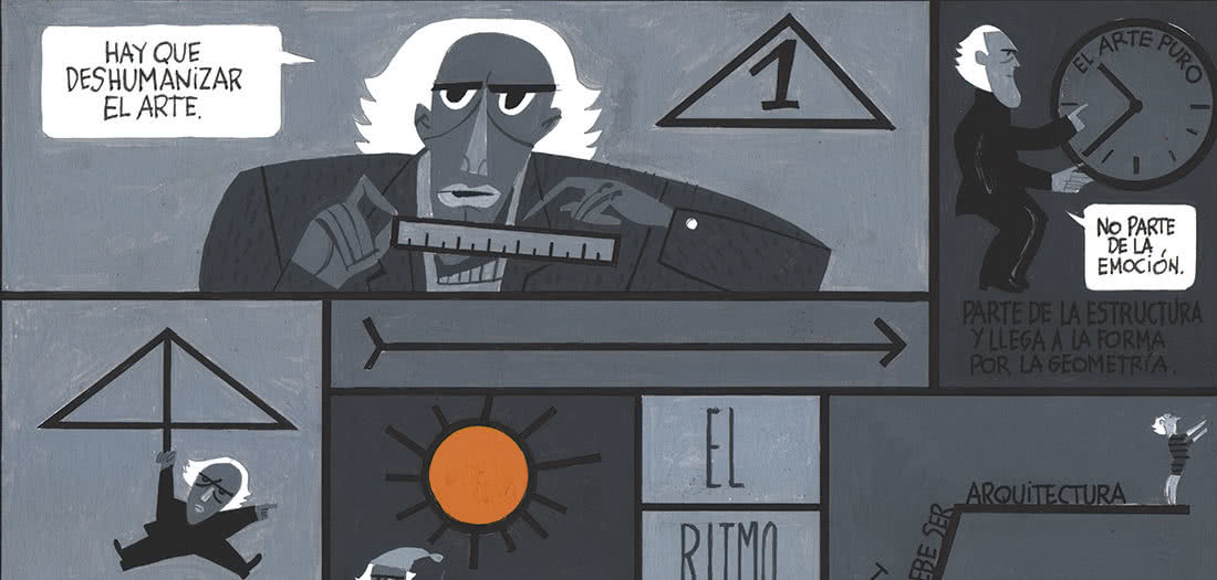 Con El arte en el cómic, Fundación Telefónica se suma a esta iniciativa encargando versiones libres de algunas de las mejores piezas de su patrimonio artístico a ilustradores e historietistas de prestigio. Así, Javier Olivares, Premio Nacional de Cómic de 2015, y Santiago García ofrecen su visión de Constructivo en blanco y negro «TBA» (1933) de Joaquín Torres García.