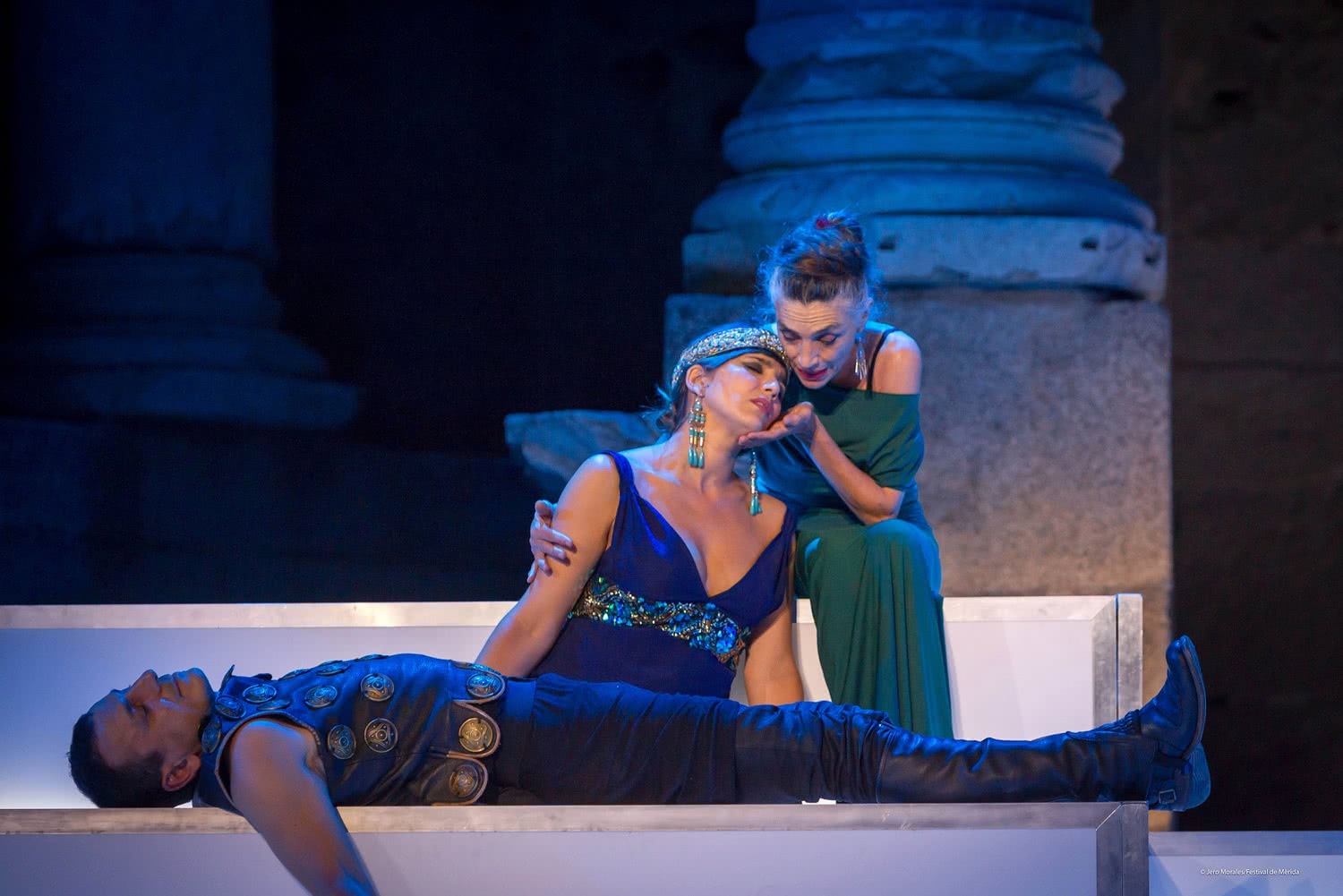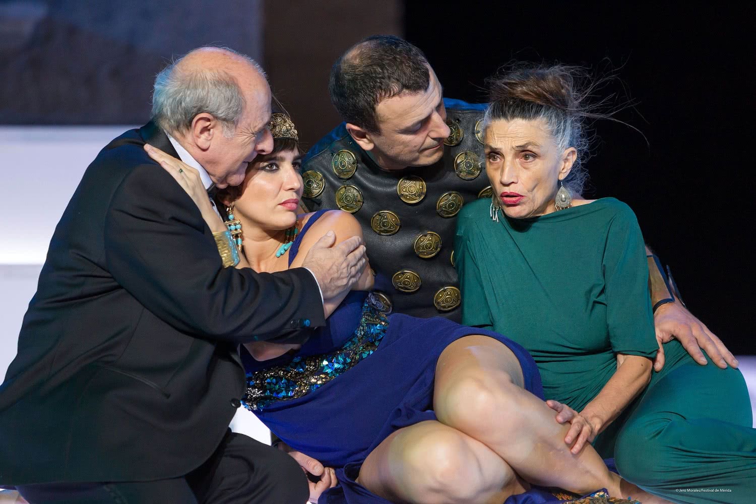 La obra escenifica la relación de amor y poder que vivieron César y Cleopatra, dos de los mayores hitos del dominio y la seducción, con cuatro actores que llevan y traen al público del pasado al presente a través de sus guerras y amores, las venganzas, las intrigas y las traiciones que rodearon la existencia de estos dos personajes. Y lo harán adoptando sobre el escenario una doble dimensión real y espiritual en dos edades diferentes, en su juventud, encarnada por Lucía Jiménez y Marcial Álvarez; y en su madurez, con Ángela Molina y Emilio Gutiérrez Caba.