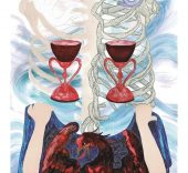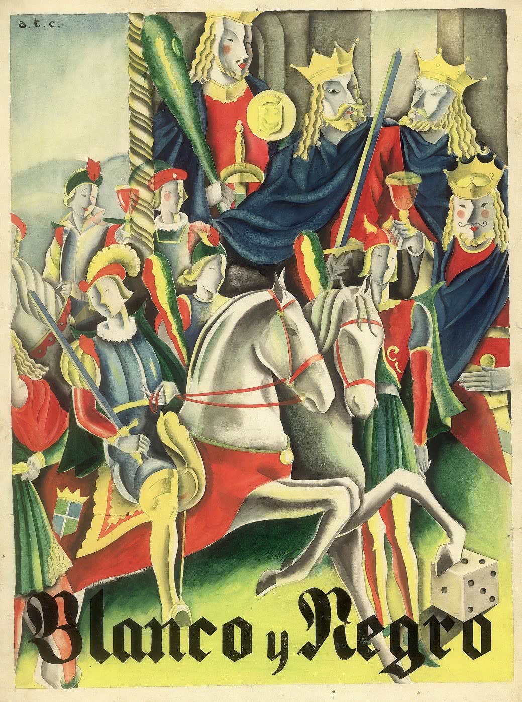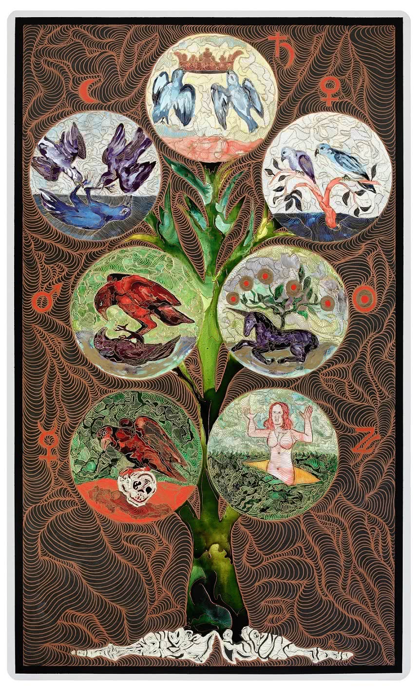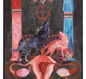 La ilustración de Torner Cervera tiene como protagonistas al rey de copas y a sus tres homólogos acompañados en una composición estridente de caballos y sotas de distintos palos. Así, el punto de partida del proyecto de Vargas va de unos naipes, los de la baraja española, a otros, los del tarot de Marsella. Y el resultado reúne las nueve cartas de una tirada que una santera cubana echó a la artista, cuyas figuras son interpretadas por Vargas con su característico vocabulario y a gran tamaño.