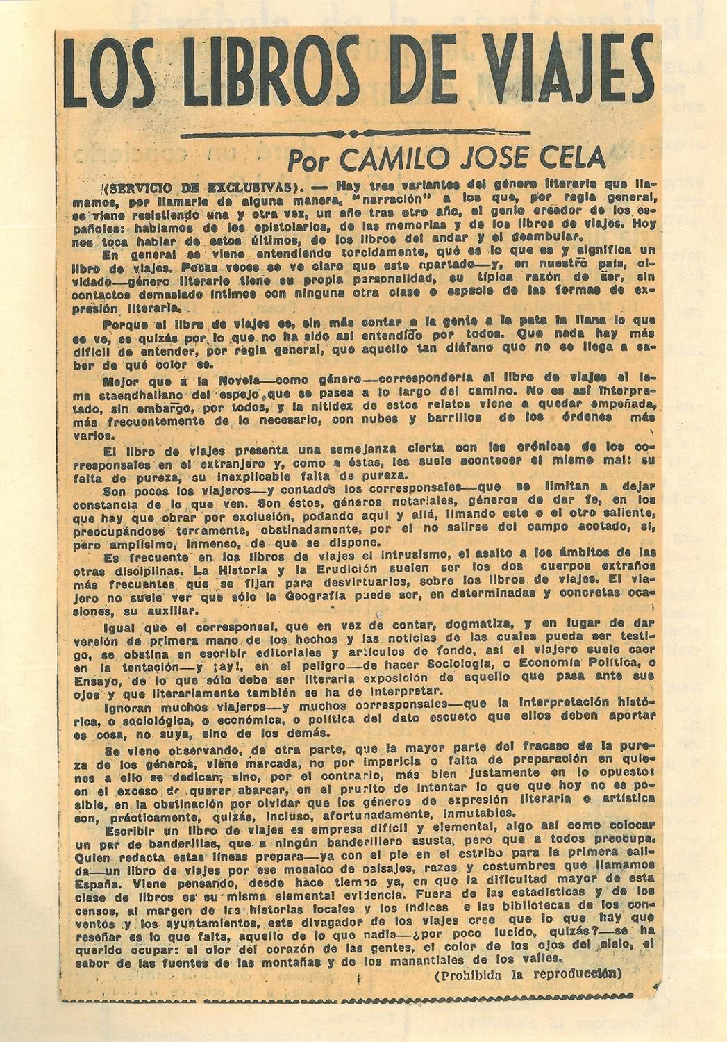 «Siempre se ofrecen documentos periodísticos que muestran la proyección de Cela en los ambientes intelectuales y en los medios culturales. Su actividad intelectual, de gestor cultural, de participación pública, están siempre presentes a lo largo de toda su trayectoria», asegura Sotelo. Otra constante de la muestra es la atención privilegiada que se concede a sus novelas. Fue el mérito esencial para la concesión del Premio Nobel y, desde luego, es el eslabón imprescindible de la novela española de la segunda mitad del siglo XX. «De todas sus novelas, desde La familia de Pascual Duarte (1942) a Madera de boj (1999) se ofrece la primera edición (en ocasiones, el manuscrito), algunas traducciones y alguna muestra de la recepción crítica que tuvieron al publicarse».