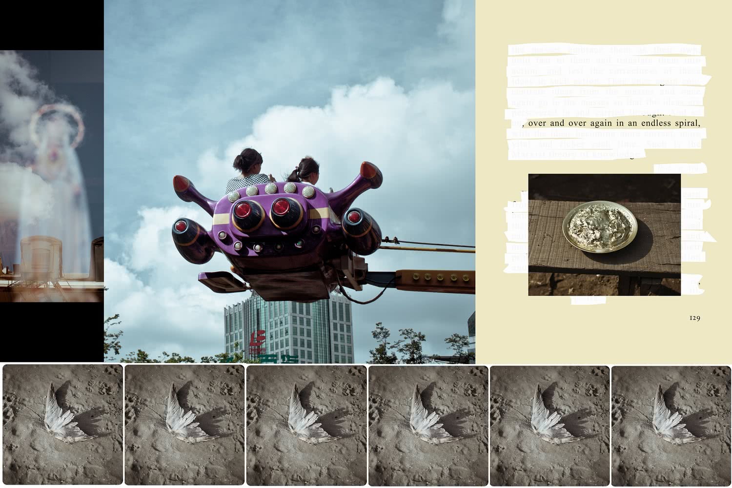 Así, las fotografías que se reúnen en esta serie son todas las copias de su inventario con todas las variaciones y adaptaciones que responden a ferias, planos de sala y comisariados. Con esas imágenes, más de 300, contó sus historias, y ahora, como si fueran palabras en una frase, juega con ellas y las redescubre. «Se trata de un juego en el que uso una palabra o frase para retomar las imágenes», asegura.