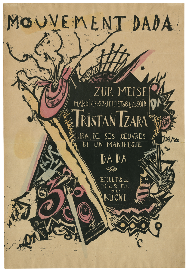 Este movimiento surgió en plena Primera Guerra Mundial en la neutral Suiza. El 5 de febrero de 1916, Hugo Ball abrió en Zúrich el Cabaret Voltaire, el cual atrajo la atención de los poetas y artistas más inquietos, convirtiéndose en un mito de la modernidad vanguardista. Por este escenario pasaron los fundadores del dadaísmo: Hugo Ball, Emmy Hennings, Hans Arp, Tristan Tzara, Marcel Janco, Walter Serner, Richard Huelsenbeck y Sophie Taeuber, entre otros.