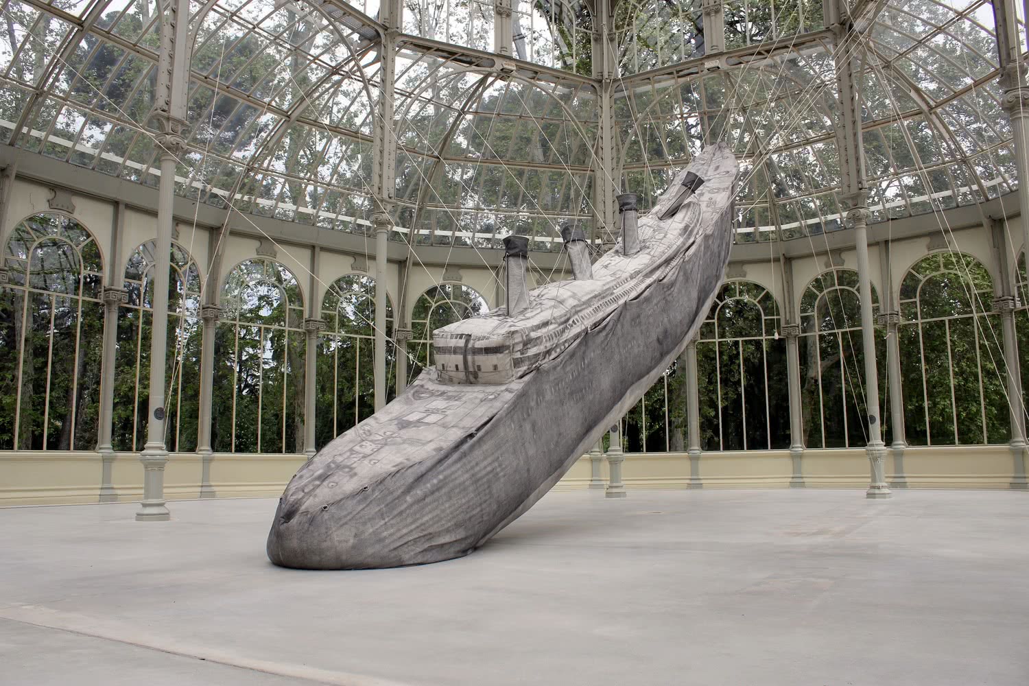 En Monumento, el Titanic se configura en una escultura blanda de lona que mide 13 metros, suspendida del techo. Sobre la tela, Ortega ha diseñado el famoso buque con lápiz de cera y tinta de plotter. La obra, que muestra al barco detenido en una caída contra el suelo, pone en cuestión su condición de símbolo y monumento.