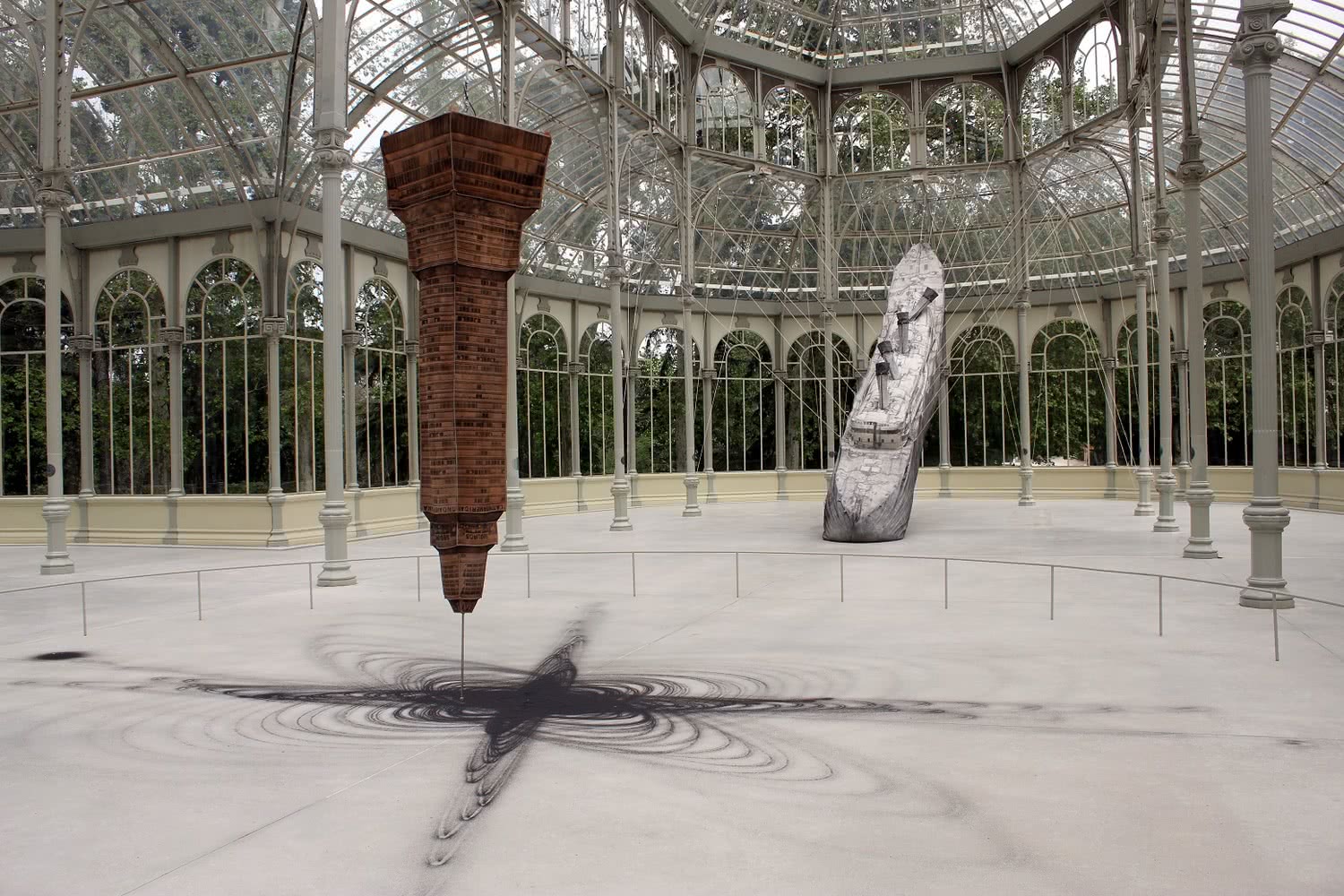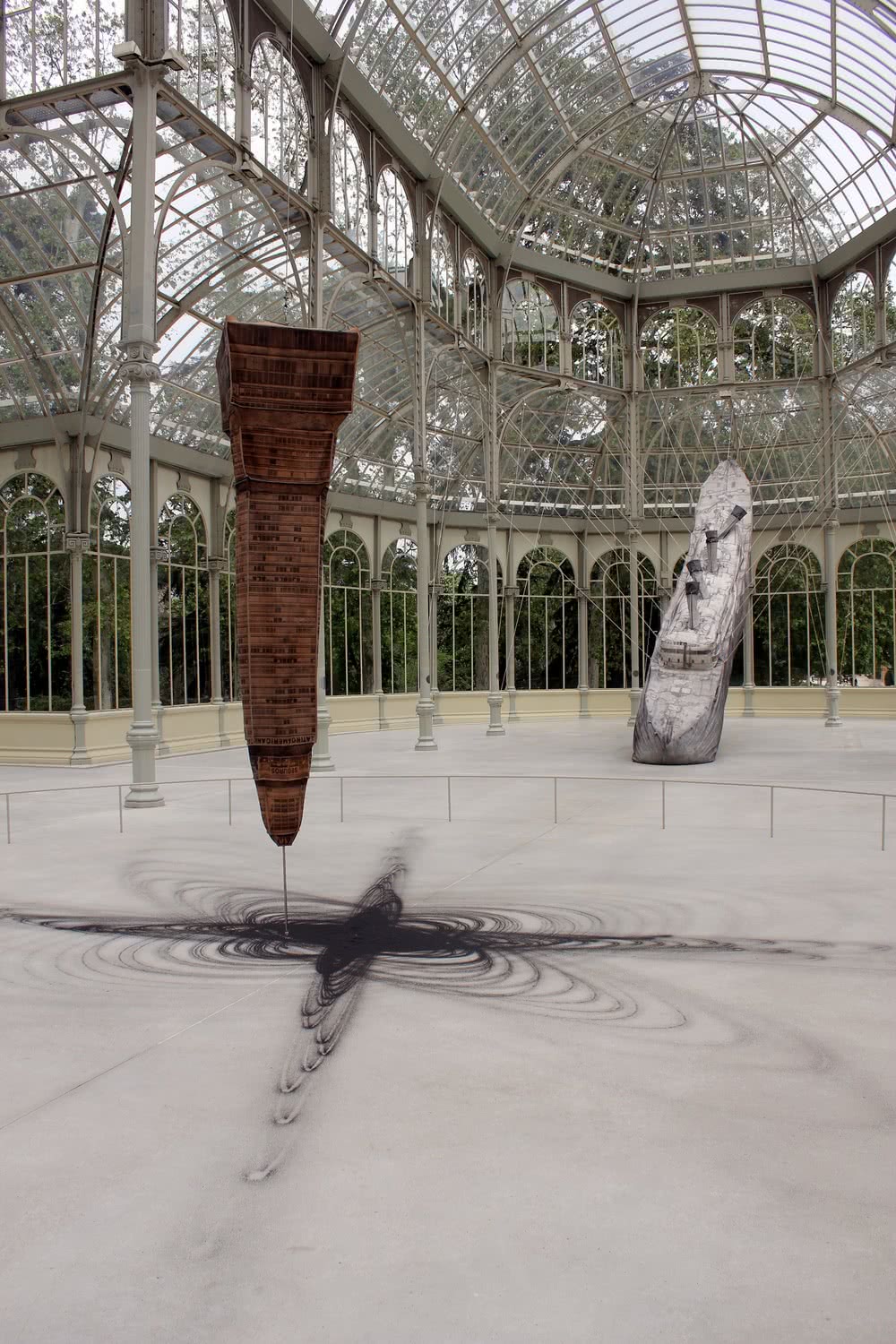 En esta ocasión, el artista mexicano hace de la torre un péndulo, invirtiéndola y colgándola de un cable de acero desde el punto más elevado del Palacio de Cristal. La obra, hecha en piel, es un reloj de arena que dibuja sobre el suelo su movimiento oscilante.