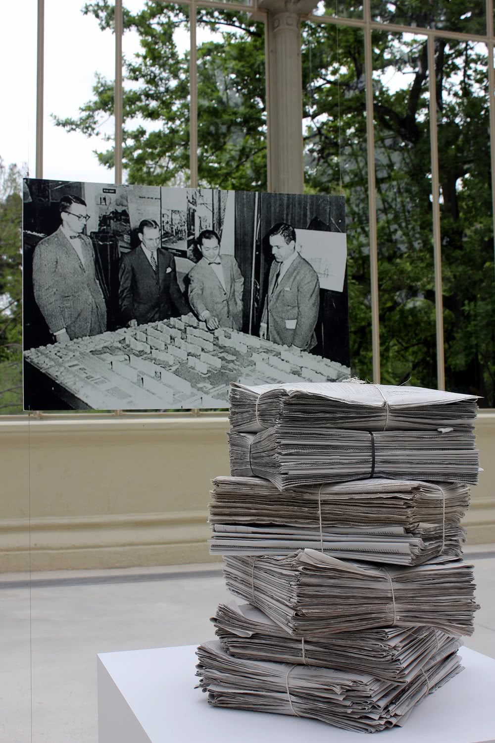 Los pensamientos de Yamasaki es una instalación formada por numerosos elementos serigrafiados con imágenes y textos que el artista ha encontrado en su investigación sobre el proyecto urbanístico Pruitt-Igoe, así como objetos que aluden a la memoria de aquellos que habitaron el complejo de edificios del arquitecto Minoru Yamasaki, también autor de las torres del World Trade Center de Nueva York.