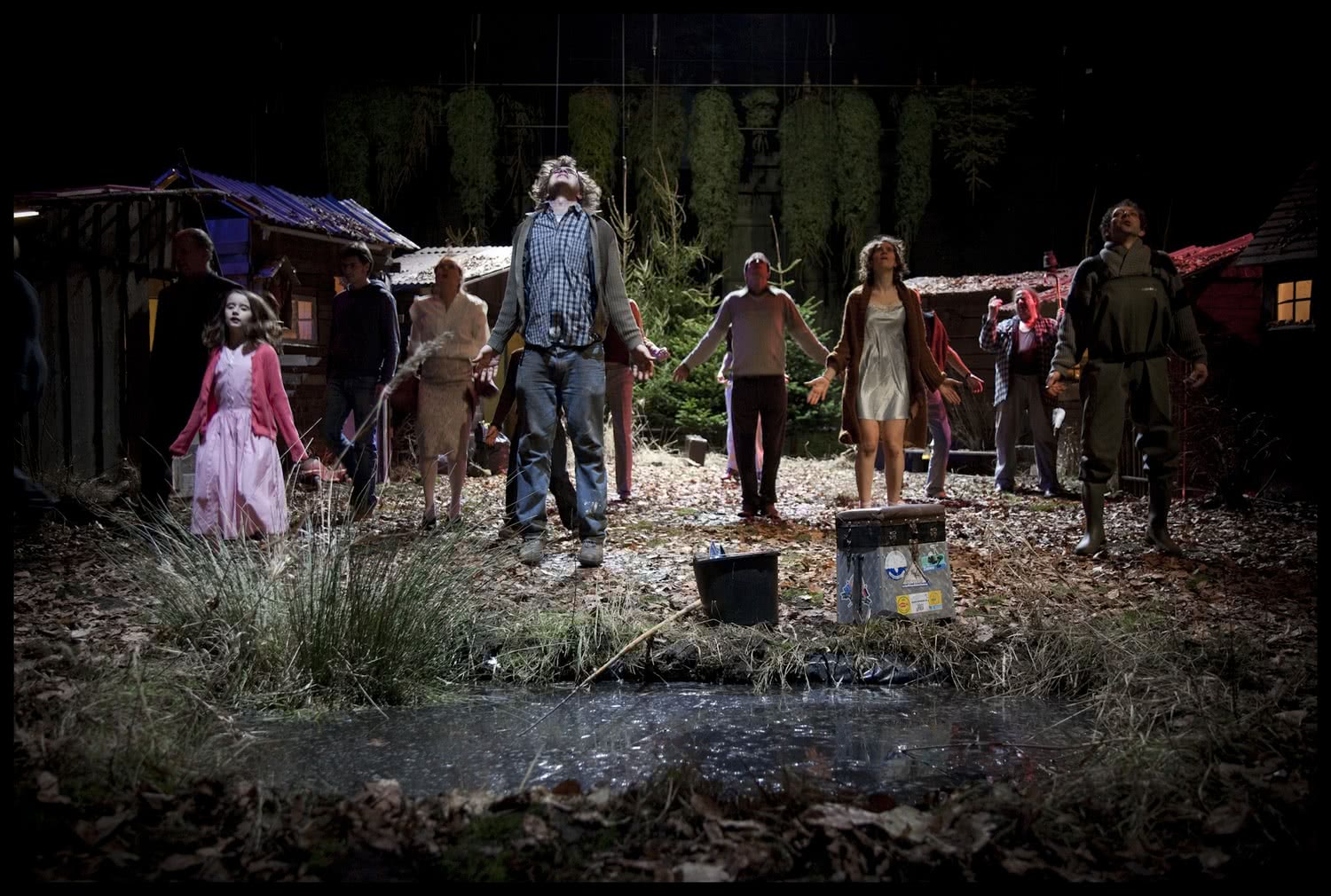 Con la mirada fija en el público, un pescador se inclina sobre un estanque. La luz se funde con unas pequeñas casas de madera y le imprime un resplandor íntimo a la escena. El olor de las hojas caídas sobre el suelo se siente en toda la sala y, durante un instante, parece como si el mundo real fuera lo que ocurre allí adentro. Un equipo de vídeo se pasea por el borde del escenario, permitiendo que el público pueda ser testigo de lo que sucede dentro de las casas gracias a tres grandes pantallas.