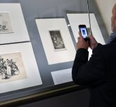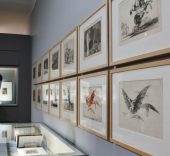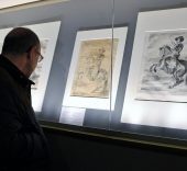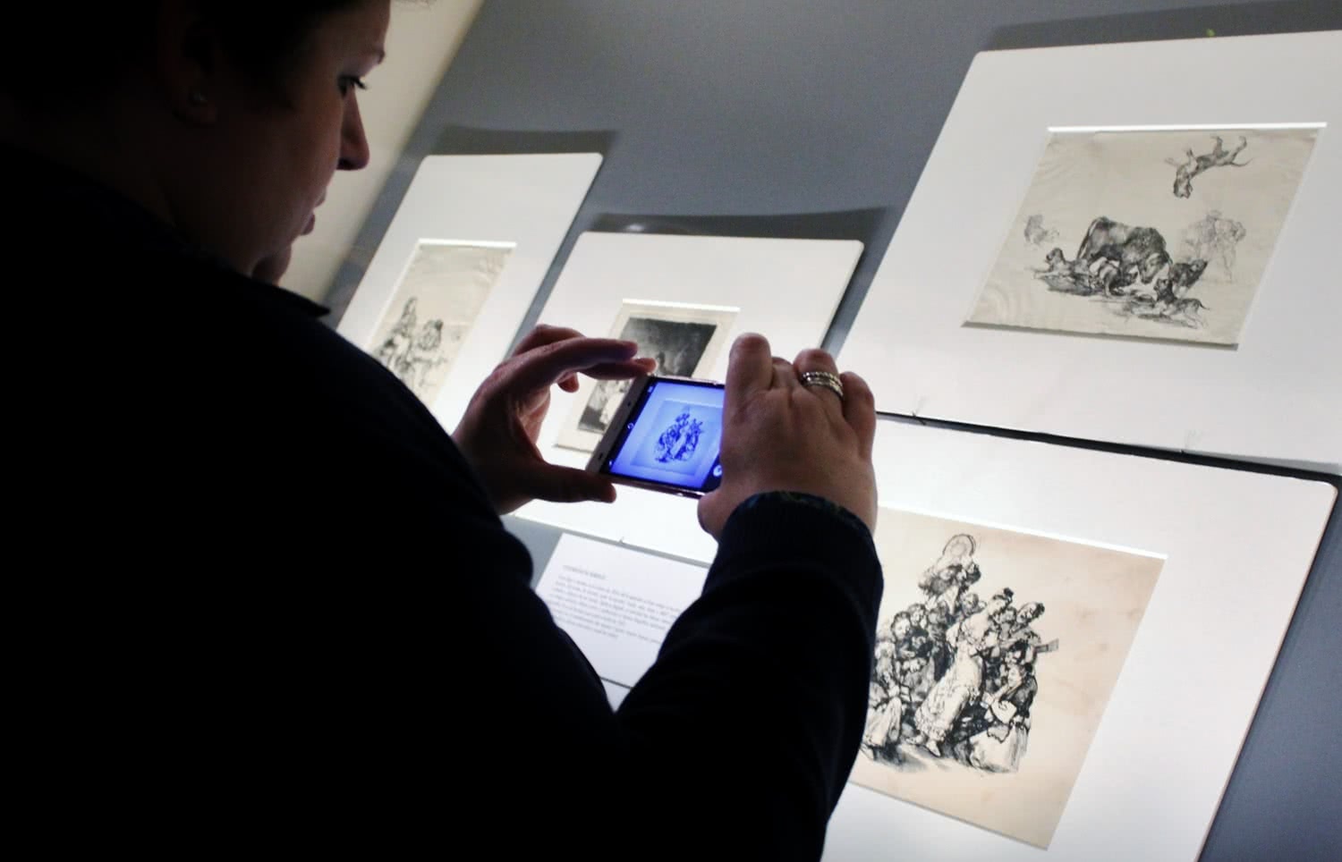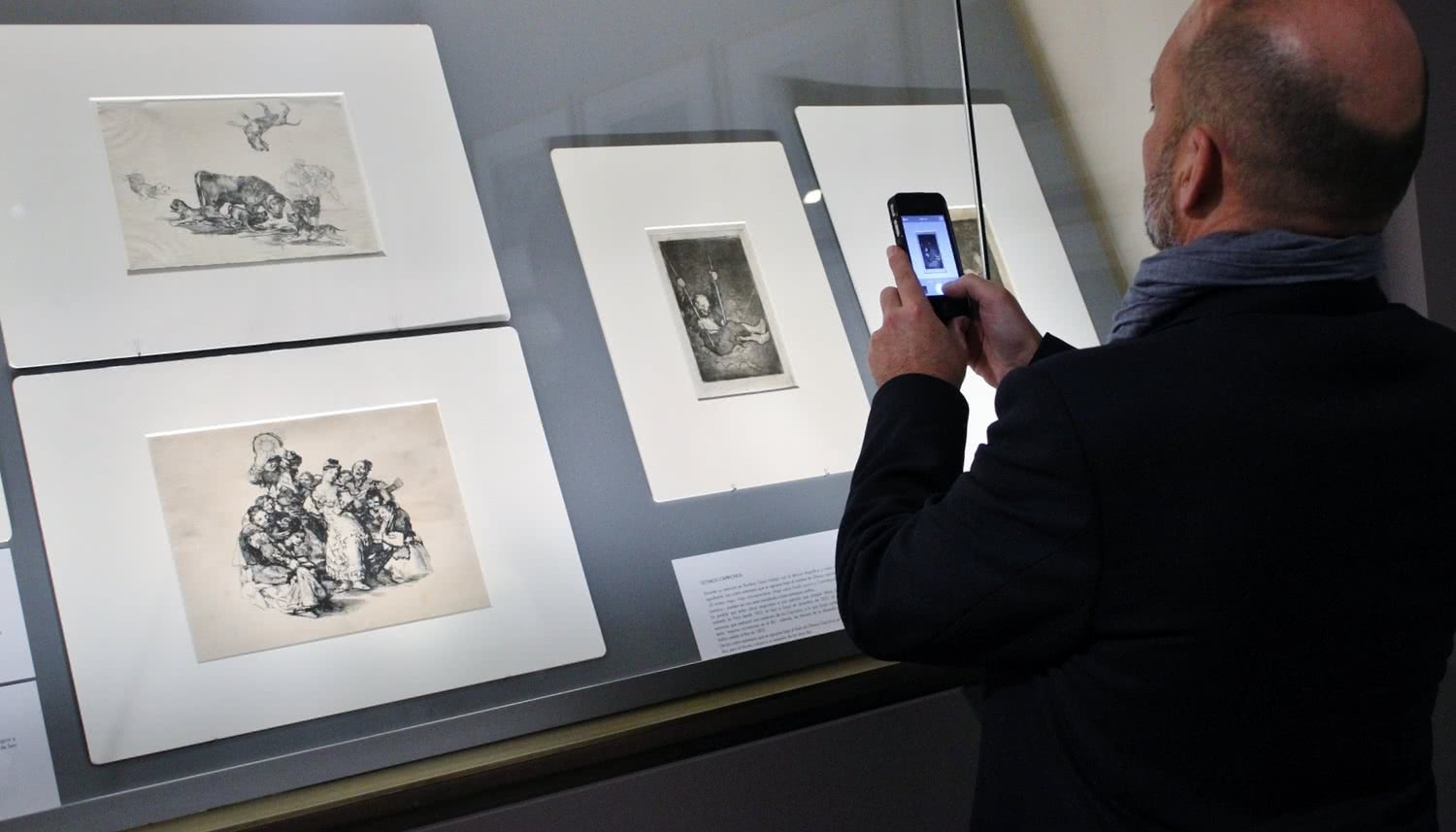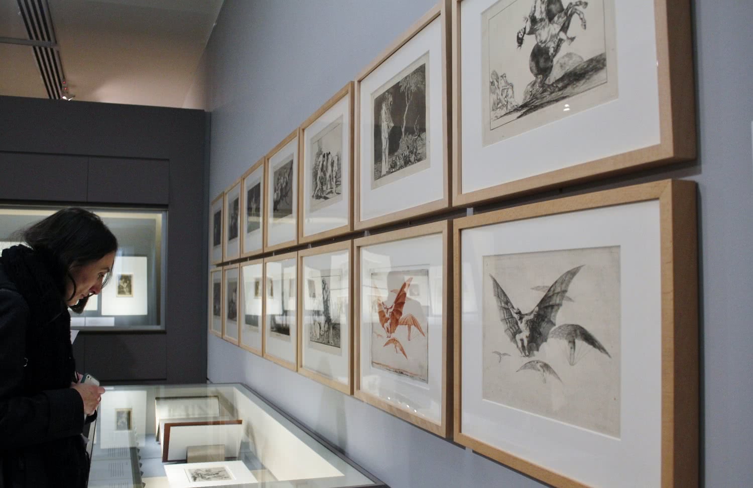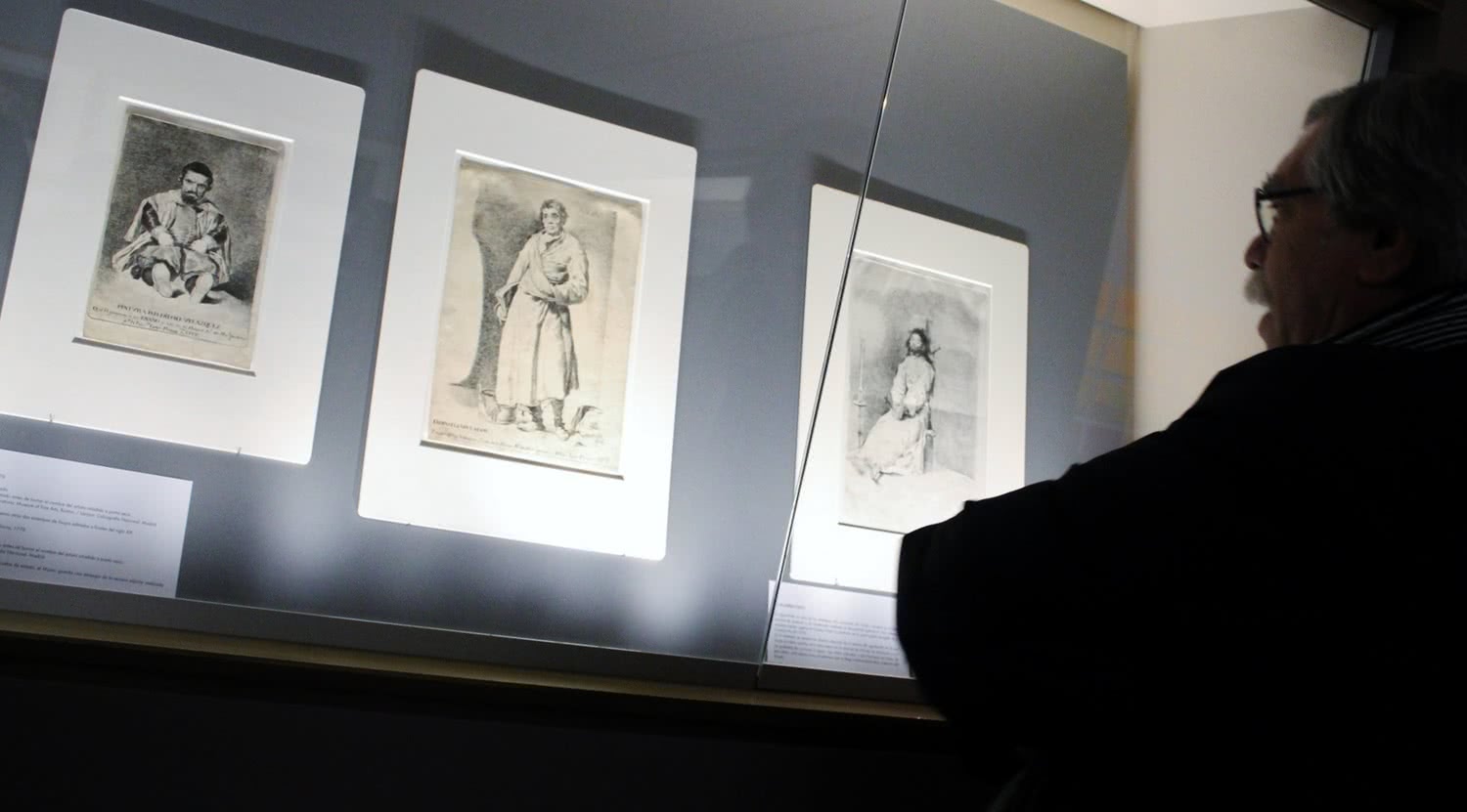 Las obras seleccionadas pertenecen a diferentes épocas en la trayectoria vital del artista, desde 1778, fecha de la primera entrega de las Pinturas de Velázquez, hasta 1825 con las famosas litografías de los Toros de Burdeos. La muestra, explica la comisaria, incluye “dos series grabadas por Goya, Caprichos y Tauromaquia; estampas sueltas de las Pinturas de Velázquez, el Agarrotado, Desastres de la Guerra y Los prisioneros; las excepcionales pruebas de estado de los Disparates, de El cantor ciego o del Viejo columpiándose, entre otras; y una selección de litografías. De los Caprichos se exponen dos ediciones: un ejemplar de la primera, editado por el propio Goya, y otro de la tercera, impreso por la Calcografía Nacional en 1868″.