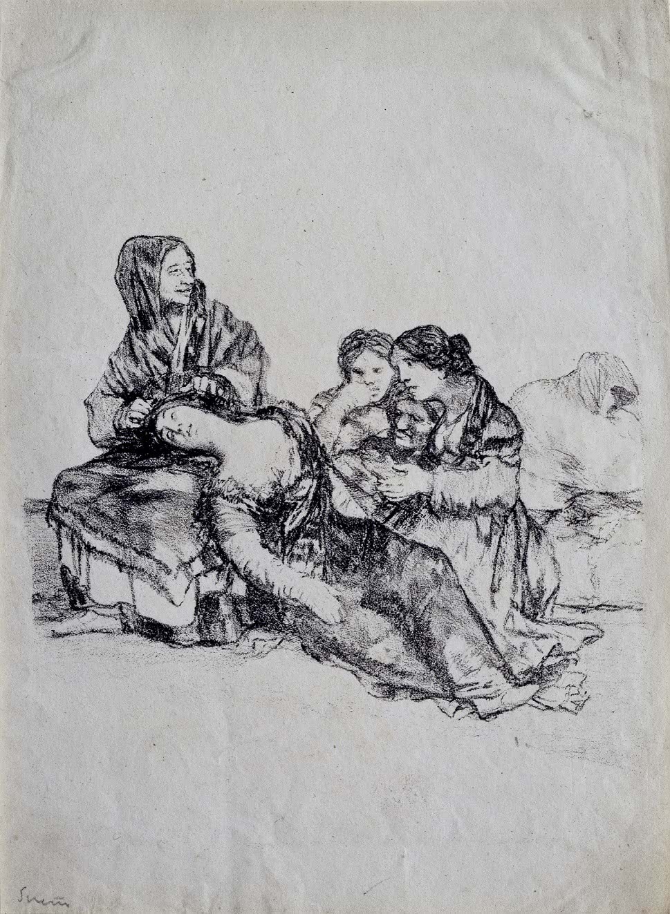 Los Desastres de la Guerra están presentes con dos estampas seleccionadas de las ochenta que componen la serie, pertenecientes a la primera edición de 1863. Una, de la primera parte, que muestra la violencia provocada por la guerra, y otra, de la tercera, conocida como Caprichos enfáticos, en los que Goya muestra diferentes aspectos de la represión absolutista, tras la finalización de la Guerra de la Independencia, y la esperanza que depositó en el nuevo gobierno liberal instaurado tras el triunfo del levantamiento del general Riego en 1820.