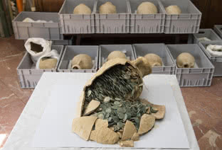 Este extraordinario conjunto monetario, compuesto por 19 ánforas romanas que contienen más de 50.000 monedas del siglo IV d.C. principalmente, de las que se han contabilizado un total de 22.470, ha tenido un gran impacto mediático y ha despertado mucha curiosidad. Desde su hallazgo el pasado mes de abril en la localidad sevillana se comenzó a preparar una exposición en la que se pueden ver 23 monedas ya intervenidas, limpias y estabilizadas, en las que se identifican los distintos emperadores bajo cuyo mandato se produjeron y los distintos reversos hasta ahora identificados. Además, y sólo durante el periodo navideño, se muestran cuatro de las nueve ánforas selladas, que en enero serán retiradas para su estudio y conservación.