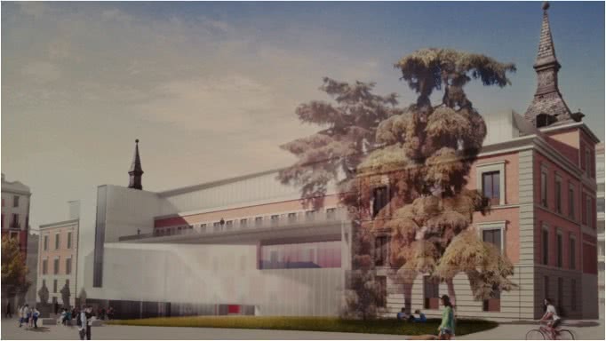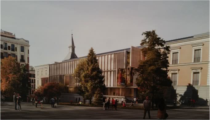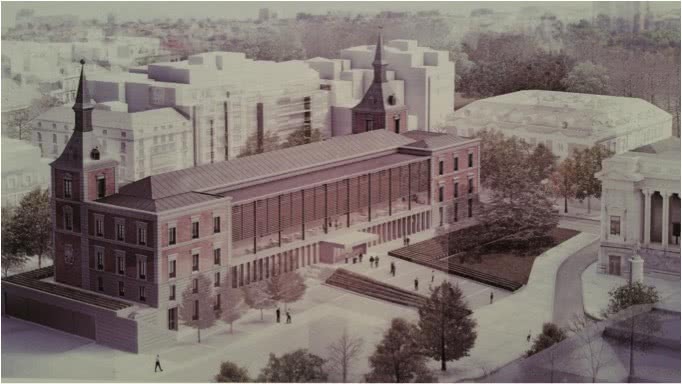 El proyecto ganador rentabiliza al máximo el uso museístico en el edificio y crea un gran atrio de acceso en la fachada sur, imprimiendo a este espacio un carácter semiabierto y permeable al exterior, pero suficientemente controlado para que sirva de protección a la fachada original del Salón de Reinos, en la que se recuperan sus huecos y balconadas. Sobre dicha fachada emerge la prolongación de un gran espacio expositivo en planta tercera, con mayor altura libre y anchura que el actual, formando la cubierta del atrio, a la vez terraza orientada al campus.